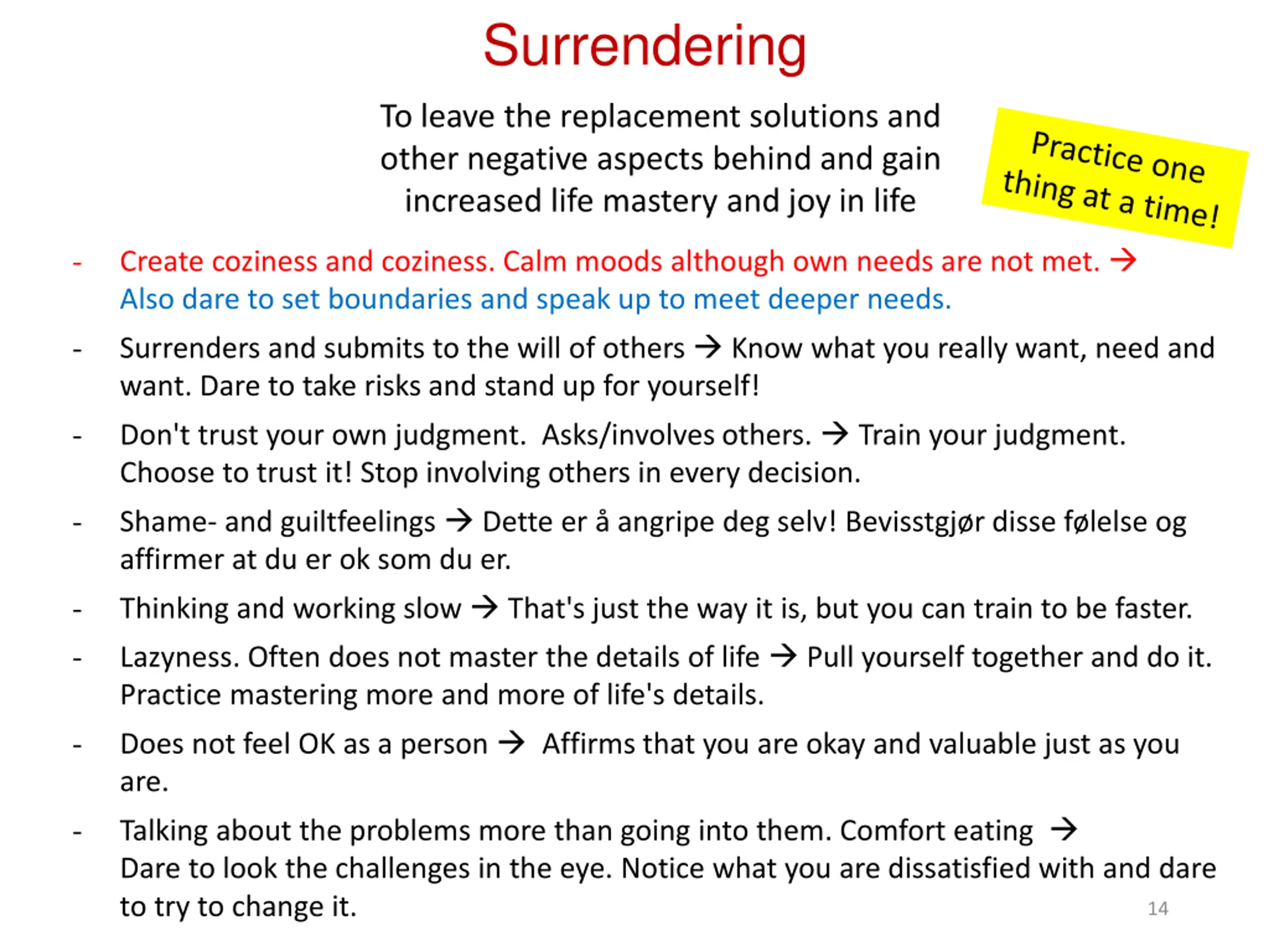 Surrendering To leave the replacement solutions and other negative aspects behind and gain increased life mastery and joy in life - Create coziness and coziness. Calm moods although own needs are not met. Also dare to set boundaries and speak up to meet deeper needs. Surrenders and submits to the will of others Know what you really want, need and want. Dare to take risks and stand up for yourself! Don't trust your own judgment. Asks/involves others. Train your judgment. Choose to trust it! Stop involving others in every decision. Shame- and guiltfeelings Dette er angripe deg selv! Bevisstgj r disse f lelse og affirmer at du er ok som du er. Thinking and working slow That's just the way it is, but you can train to be faster. Lazyness. Often does not master the details of life Pull yourself together and do it. Practice mastering more and more of life's details. Does not feel OK as a person Affirms that you are okay and valuable just as you are. Talking about the problems more than going into them. Comfort eating Dare to look the challenges in the eye. Notice what you are dissatisfied with and dare to try to change it. - - - - - - - 14