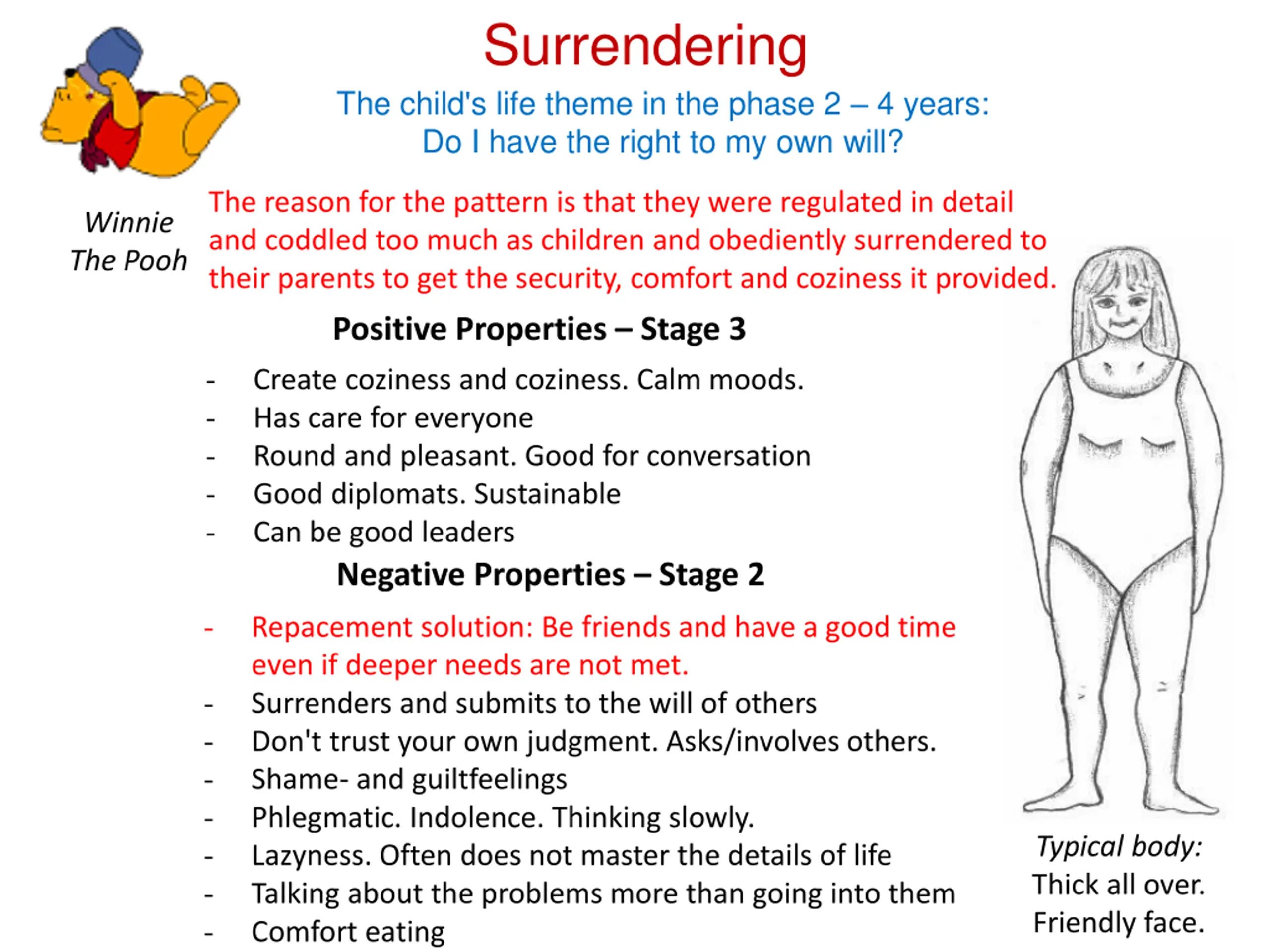 Surrendering The child's life theme in the phase 2 4 years: Do I have the right to my own will? The reason for the pattern is that they were regulated in detail and coddled too much as children and obediently surrendered to their parents to get the security, comfort and coziness it provided. Positive Properties Stage 3 - Create coziness and coziness. Calm moods. - Has care for everyone - Round and pleasant. Good for conversation - Good diplomats. Sustainable - Can be good leaders Negative Properties Stage 2 - Repacement solution: Be friends and have a good time even if deeper needs are not met. - Surrenders and submits to the will of others - Don't trust your own judgment. Asks/involves others. - Shame- and guiltfeelings - Phlegmatic. Indolence. Thinking slowly. - Lazyness. Often does not master the details of life - Talking about the problems more than going into them - Comfort eating Winnie The Pooh Typical body: Thick all over. Friendly face.