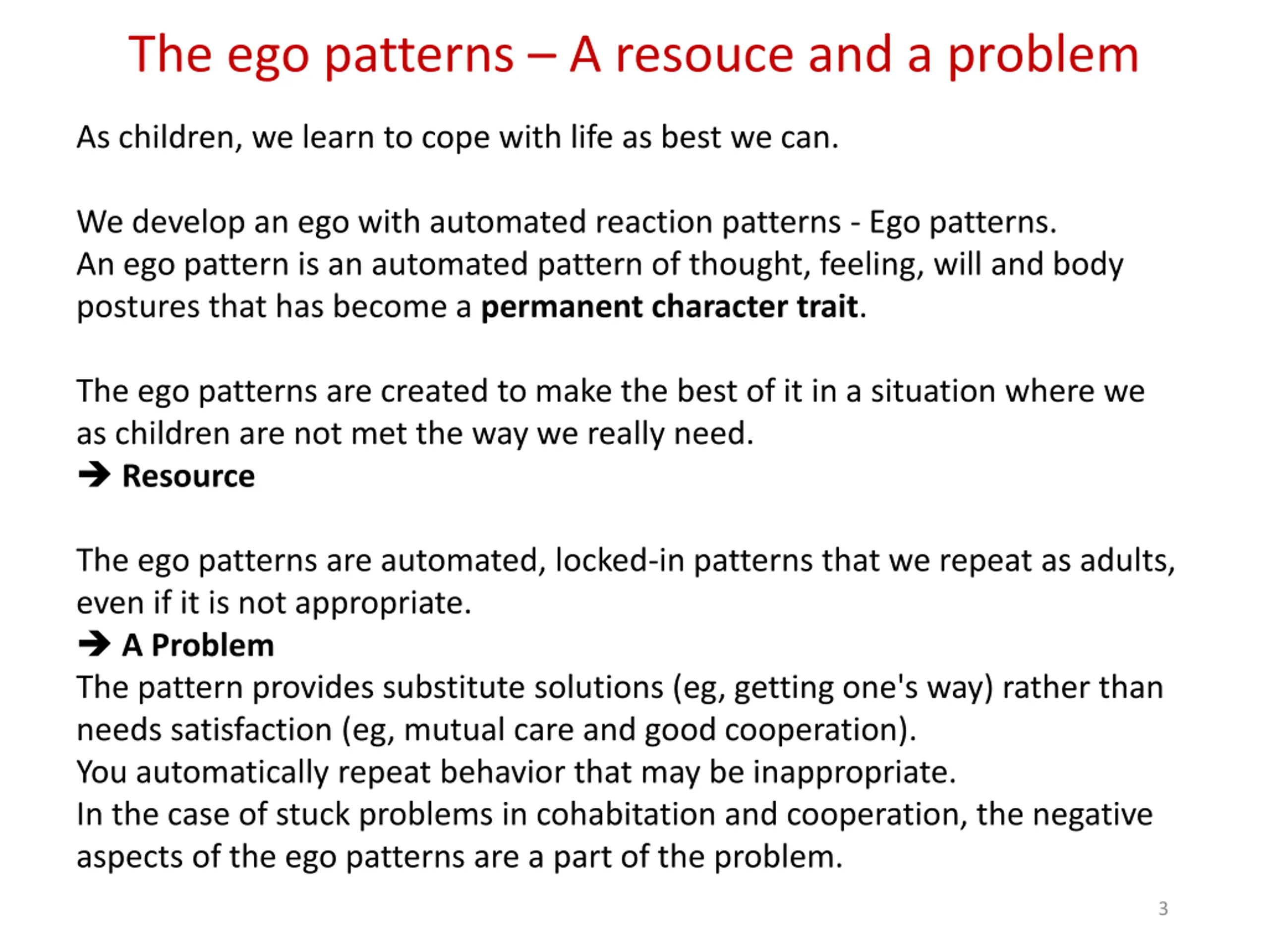 The ego patterns A resouce and a problem As children, we learn to cope with life as best we can. We develop an ego with automated reaction patterns - Ego patterns. An ego pattern is an automated pattern of thought, feeling, will and body postures that has become a permanent character trait. The ego patterns are created to make the best of it in a situation where we as children are not met the way we really need. Resource The ego patterns are automated, locked-in patterns that we repeat as adults, even if it is not appropriate. A Problem The pattern provides substitute solutions (eg, getting one's way) rather than needs satisfaction (eg, mutual care and good cooperation). You automatically repeat behavior that may be inappropriate. In the case of stuck problems in cohabitation and cooperation, the negative aspects of the ego patterns are a part of the problem. 3