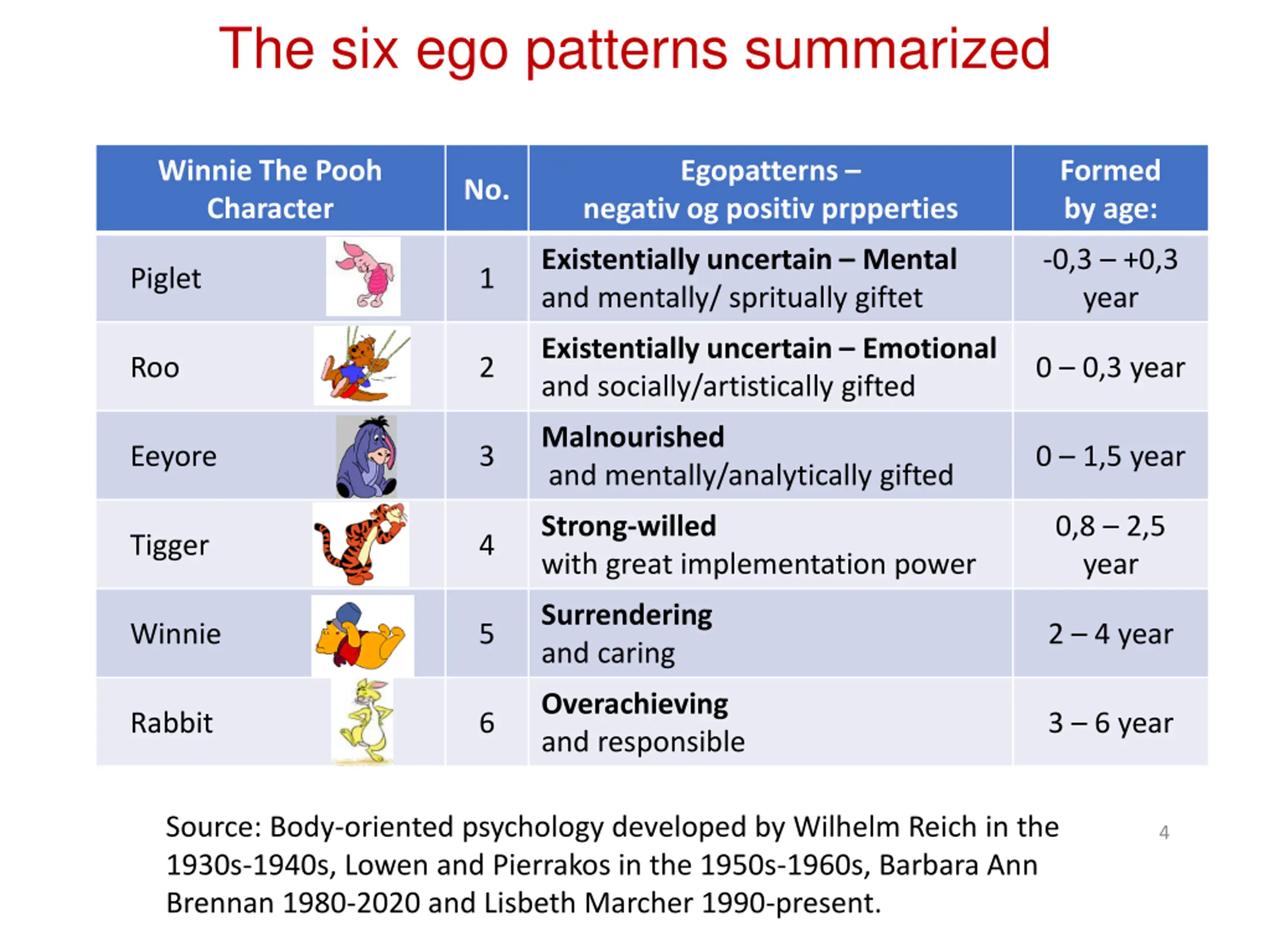 The six ego patterns summarized Winnie The Pooh Character Egopatterns Formed by age: No. negativ og positiv prpperties Existentially uncertain Mental and mentally/ spritually giftet -0,3 +0,3 year Piglet 1 Existentially uncertain Emotional and socially/artistically gifted Roo 2 0 0,3 year Malnourished and mentally/analytically gifted Eeyore 3 0 1,5 year Strong-willed with great implementation power 0,8 2,5 year Tigger 4 Surrendering and caring Winnie 5 2 4 year Overachieving and responsible Rabbit 6 3 6 year Source: Body-oriented psychology developed by Wilhelm Reich in the 1930s-1940s, Lowen and Pierrakos in the 1950s-1960s, Barbara Ann Brennan 1980-2020 and Lisbeth Marcher 1990-present. 4
