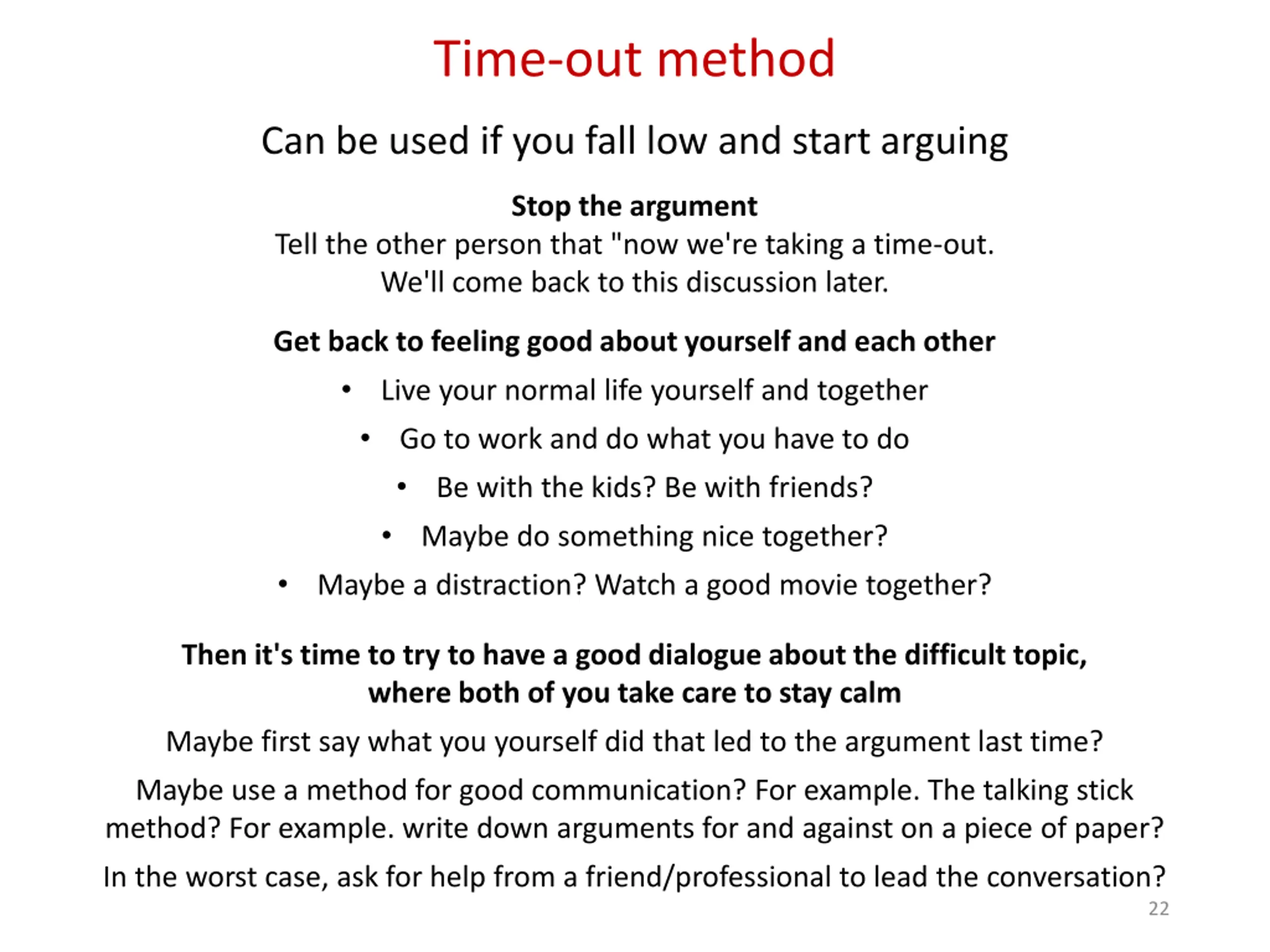Time-out method Can be used if you fall low and start arguing Stop the argument Tell the other person that "now we're taking a time-out. We'll come back to this discussion later. Get back to feeling good about yourself and each other Live your normal life yourself and together Go to work and do what you have to do Be with the kids? Be with friends? Maybe do something nice together? Maybe a distraction? Watch a good movie together? Then it's time to try to have a good dialogue about the difficult topic, where both of you take care to stay calm Maybe first say what you yourself did that led to the argument last time? Maybe use a method for good communication? For example. The talking stick method? For example. write down arguments for and against on a piece of paper? In the worst case, ask for help from a friend/professional to lead the conversation? 22