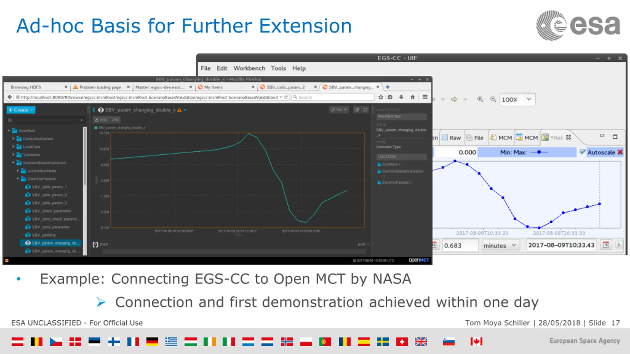 Ad-hoc Basis for Further Extension EKSE scripts can serve as ad-hoc adapters Enable quick and simple connection to external systems for technology demonstrations and prototypes Example: Connecting EGS-CC to Open MCT by NASA Connection and first demonstration achieved within one day ESA UNCLASSIFIED - For Official Use Tom Moya Schiller | 28/05/2018 | Slide 17
