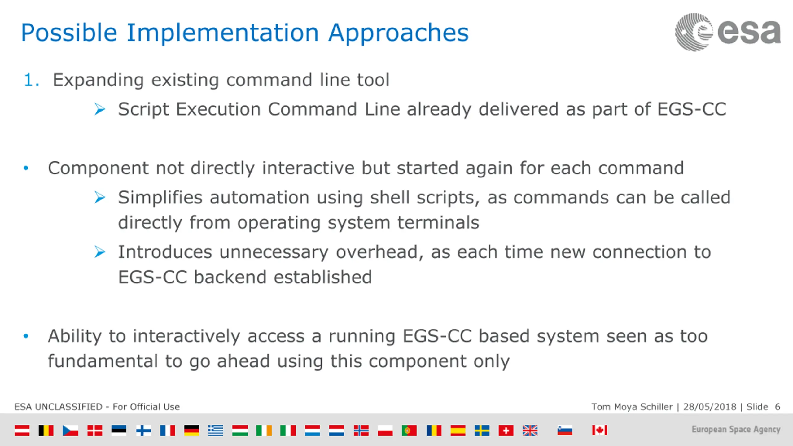 Possible Implementation Approaches 1. Expanding existing command line tool Script Execution Command Line already delivered as part of EGS-CC Component not directly interactive but started again for each command Simplifies automation using shell scripts, as commands can be called directly from operating system terminals Introduces unnecessary overhead, as each time new connection to EGS-CC backend established Ability to interactively access a running EGS-CC based system seen as too fundamental to go ahead using this component only ESA UNCLASSIFIED - For Official Use Tom Moya Schiller | 28/05/2018 | Slide 6