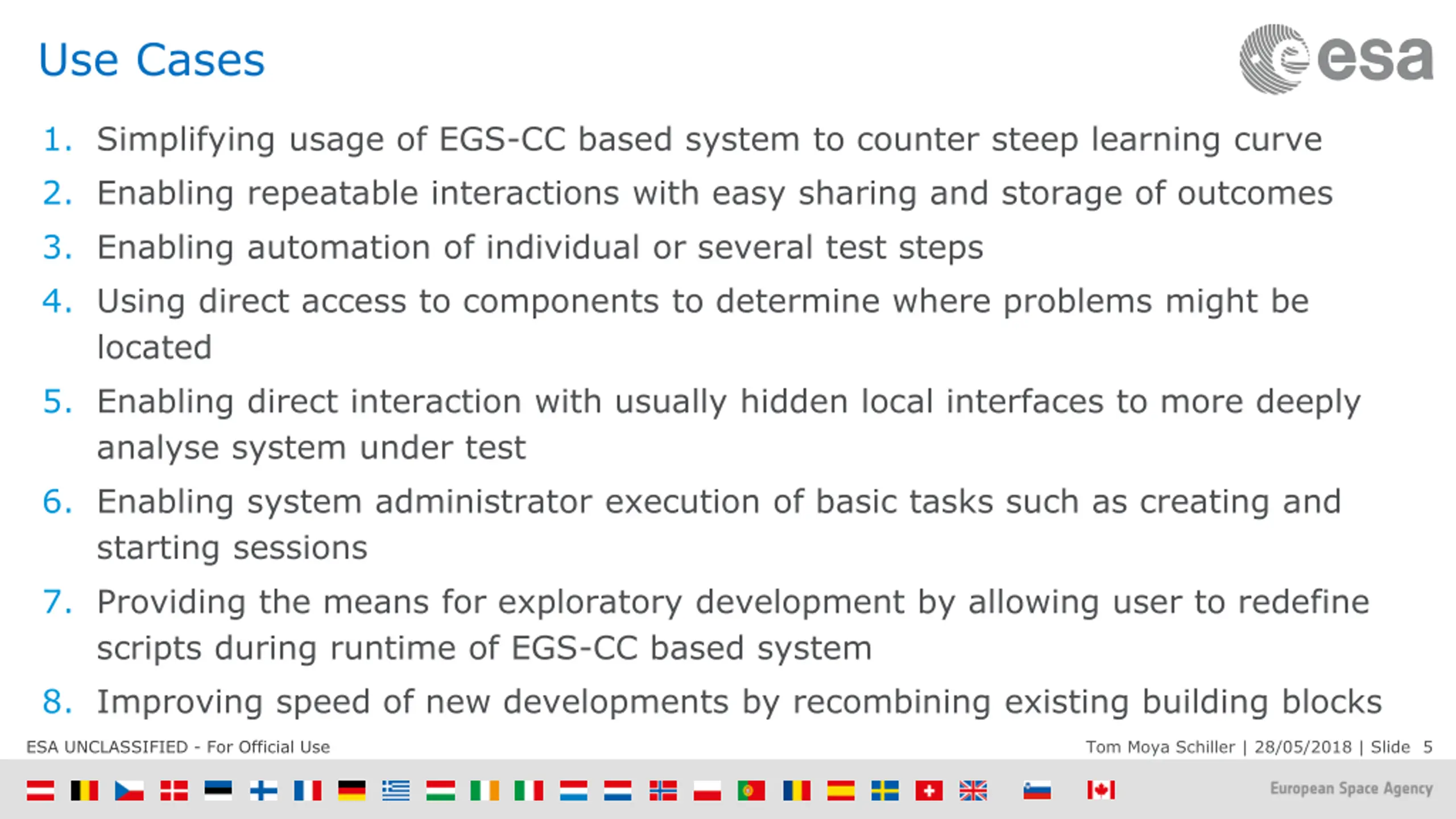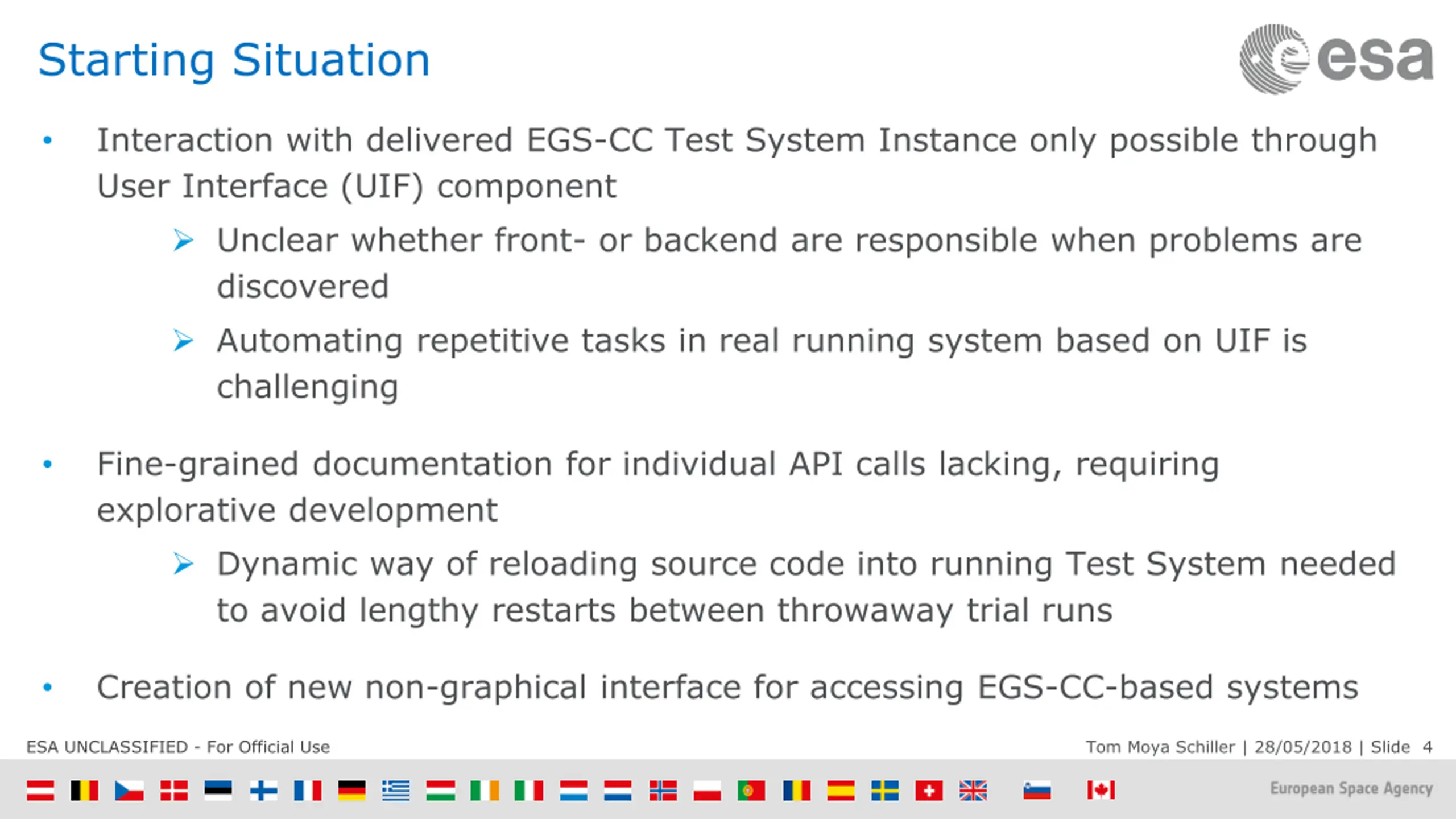 Starting Situation Interaction with delivered EGS-CC Test System Instance only possible through User Interface (UIF) component Unclear whether front- or backend are responsible when problems are discovered Automating repetitive tasks in real running system based on UIF is challenging Fine-grained documentation for individual API calls lacking, requiring explorative development Dynamic way of reloading source code into running Test System needed to avoid lengthy restarts between throwaway trial runs Creation of new non-graphical interface for accessing EGS-CC-based systems ESA UNCLASSIFIED - For Official Use Tom Moya Schiller | 28/05/2018 | Slide 4