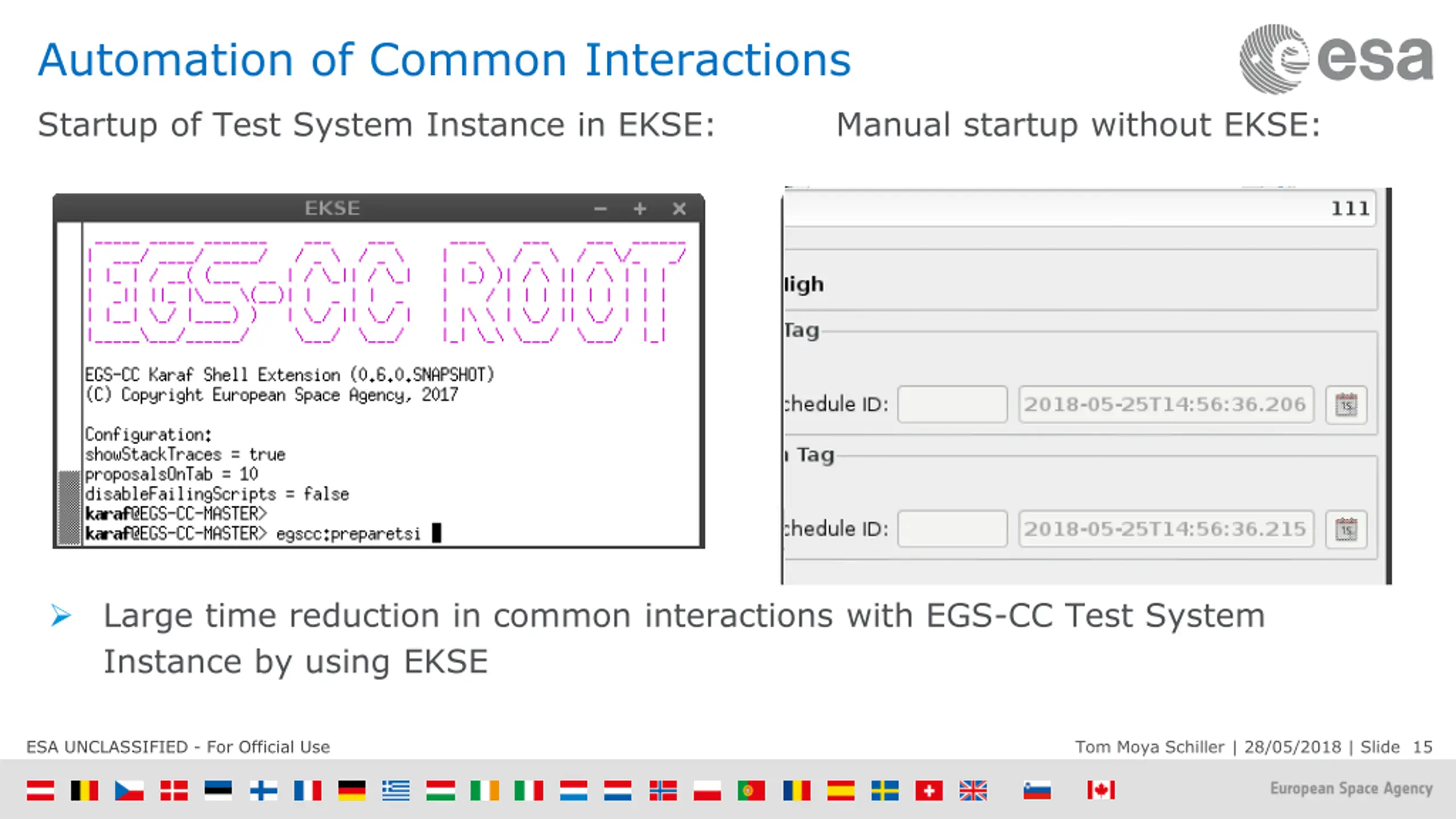Automation of Common Interactions Startup of Test System Instance in EKSE: Manual startup without EKSE: Enter egscc:preparetsi Large time reduction in common interactions with EGS-CC Test System Instance by using EKSE Wait until sessions have been started Enter login credentials Create New Session Profile Enter preparation session data Start preparation session Await session startup After session has started await completion message Then create a new session profile Enter mandcops session configuration Start the mandcops session Join the mandcops session Switch to Monitoring perspective Select the StartTmFlow activity and invoke it Log in ESA UNCLASSIFIED - For Official Use Tom Moya Schiller | 28/05/2018 | Slide 15