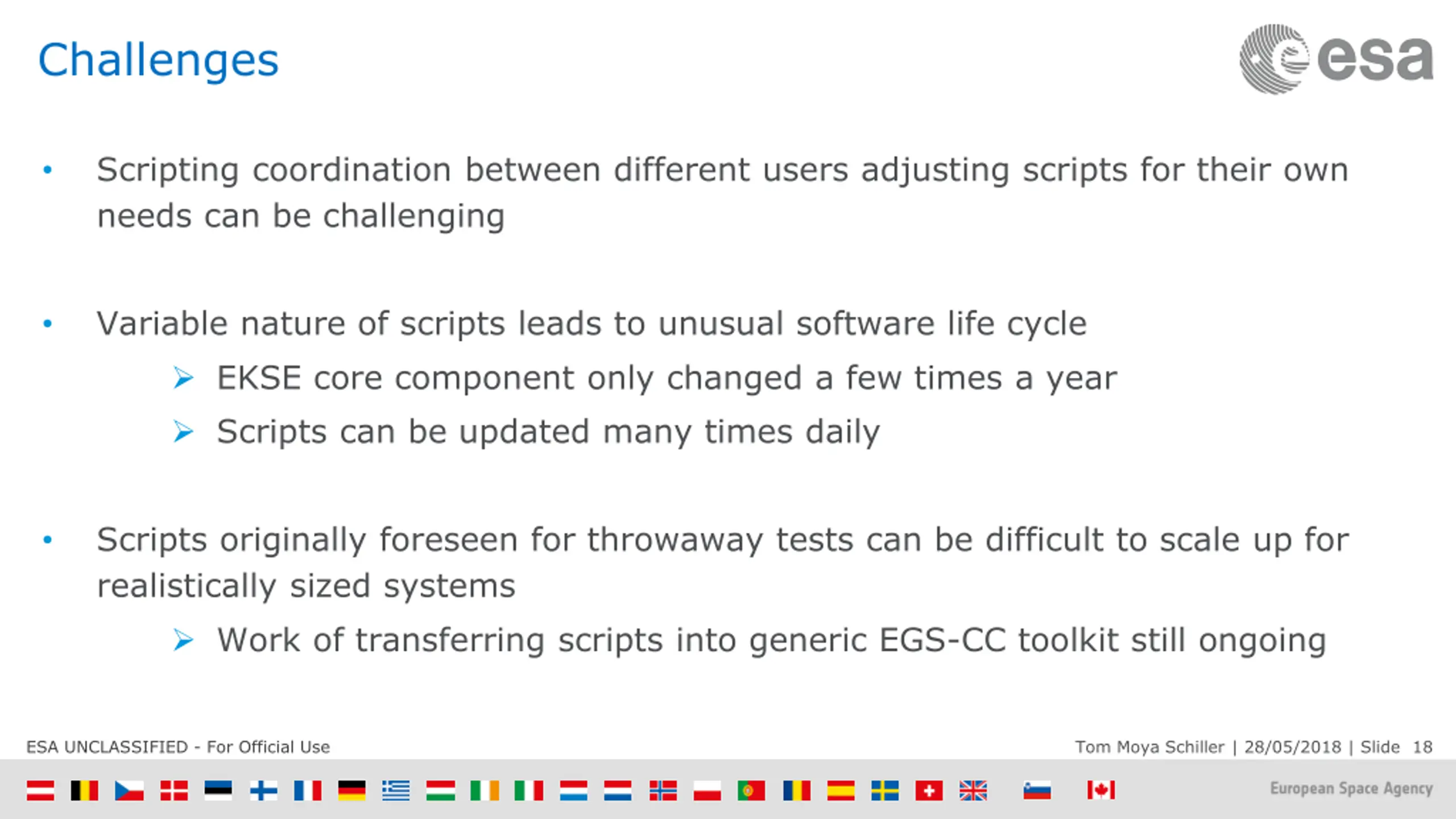 Challenges Scripting coordination between different users adjusting scripts for their own needs can be challenging Variable nature of scripts leads to unusual software life cycle EKSE core component only changed a few times a year Scripts can be updated many times daily Scripts originally foreseen for throwaway tests can be difficult to scale up for realistically sized systems Work of transferring scripts into generic EGS-CC toolkit still ongoing ESA UNCLASSIFIED - For Official Use Tom Moya Schiller | 28/05/2018 | Slide 18