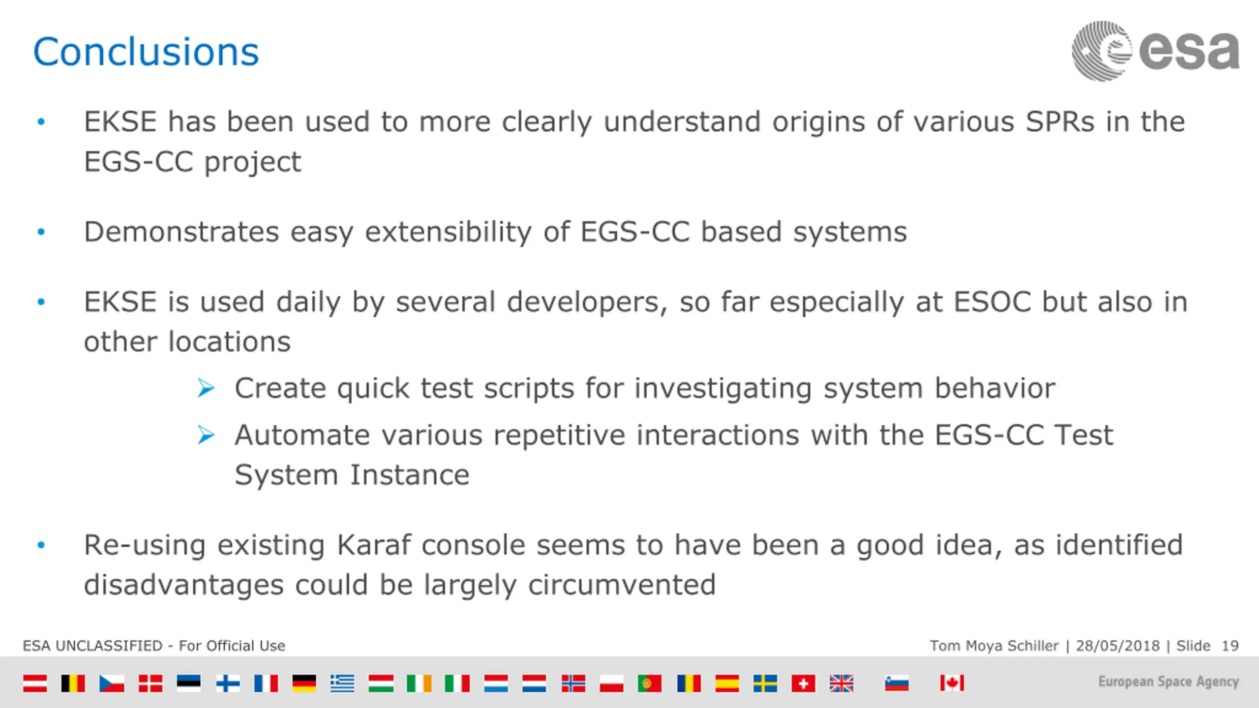 Conclusions EKSE has been used to more clearly understand origins of various SPRs in the EGS-CC project Demonstrates easy extensibility of EGS-CC based systems EKSE is used daily by several developers, so far especially at ESOC but also in other locations Create quick test scripts for investigating system behavior Automate various repetitive interactions with the EGS-CC Test System Instance Re-using existing Karaf console seems to have been a good idea, as identified disadvantages could be largely circumvented ESA UNCLASSIFIED - For Official Use Tom Moya Schiller | 28/05/2018 | Slide 19
