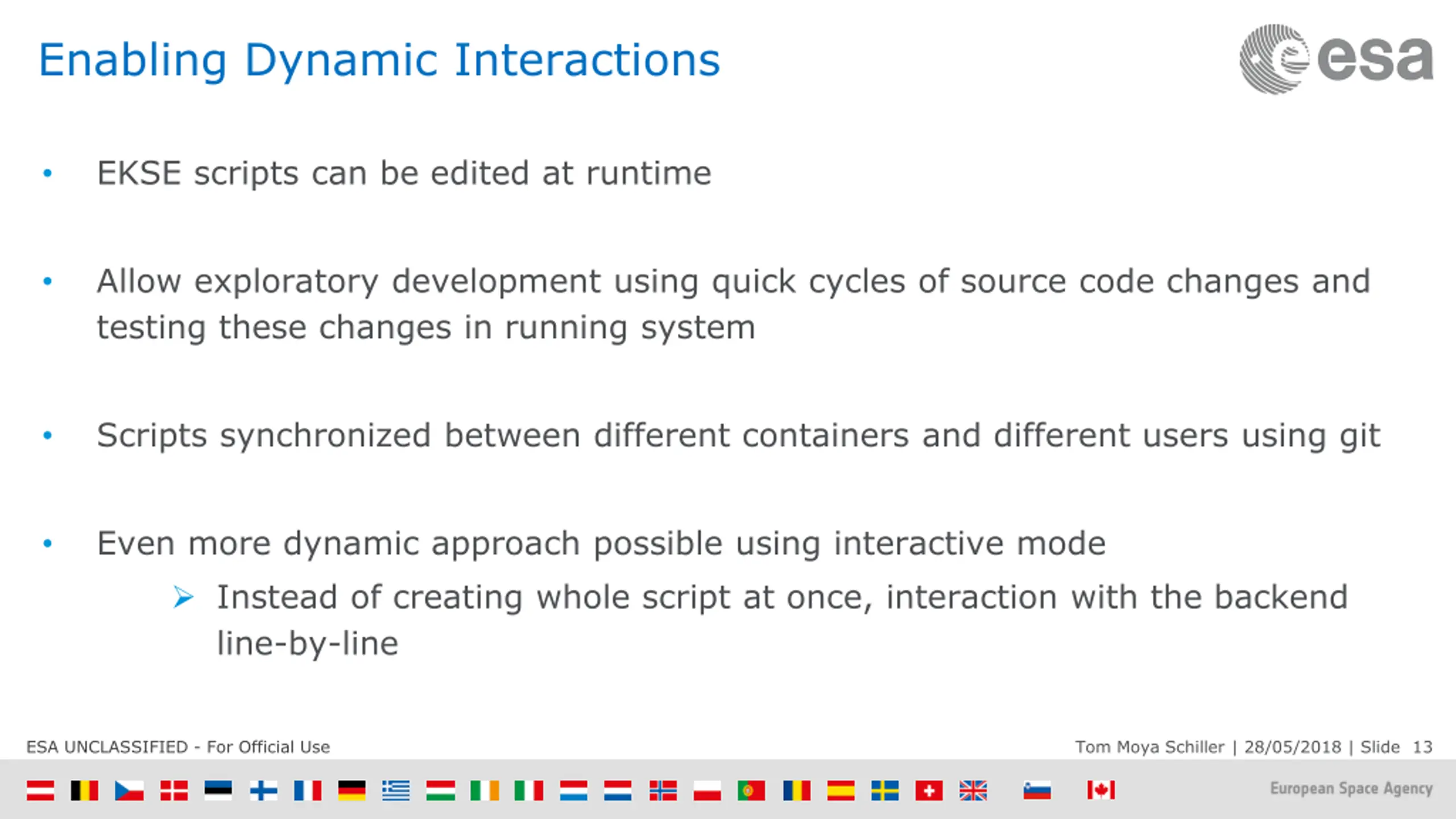Enabling Dynamic Interactions EKSE scripts can be edited at runtime Allow exploratory development using quick cycles of source code changes and testing these changes in running system Scripts synchronized between different containers and different users using git Even more dynamic approach possible using interactive mode Instead of creating whole script at once, interaction with the backend line-by-line ESA UNCLASSIFIED - For Official Use Tom Moya Schiller | 28/05/2018 | Slide 13