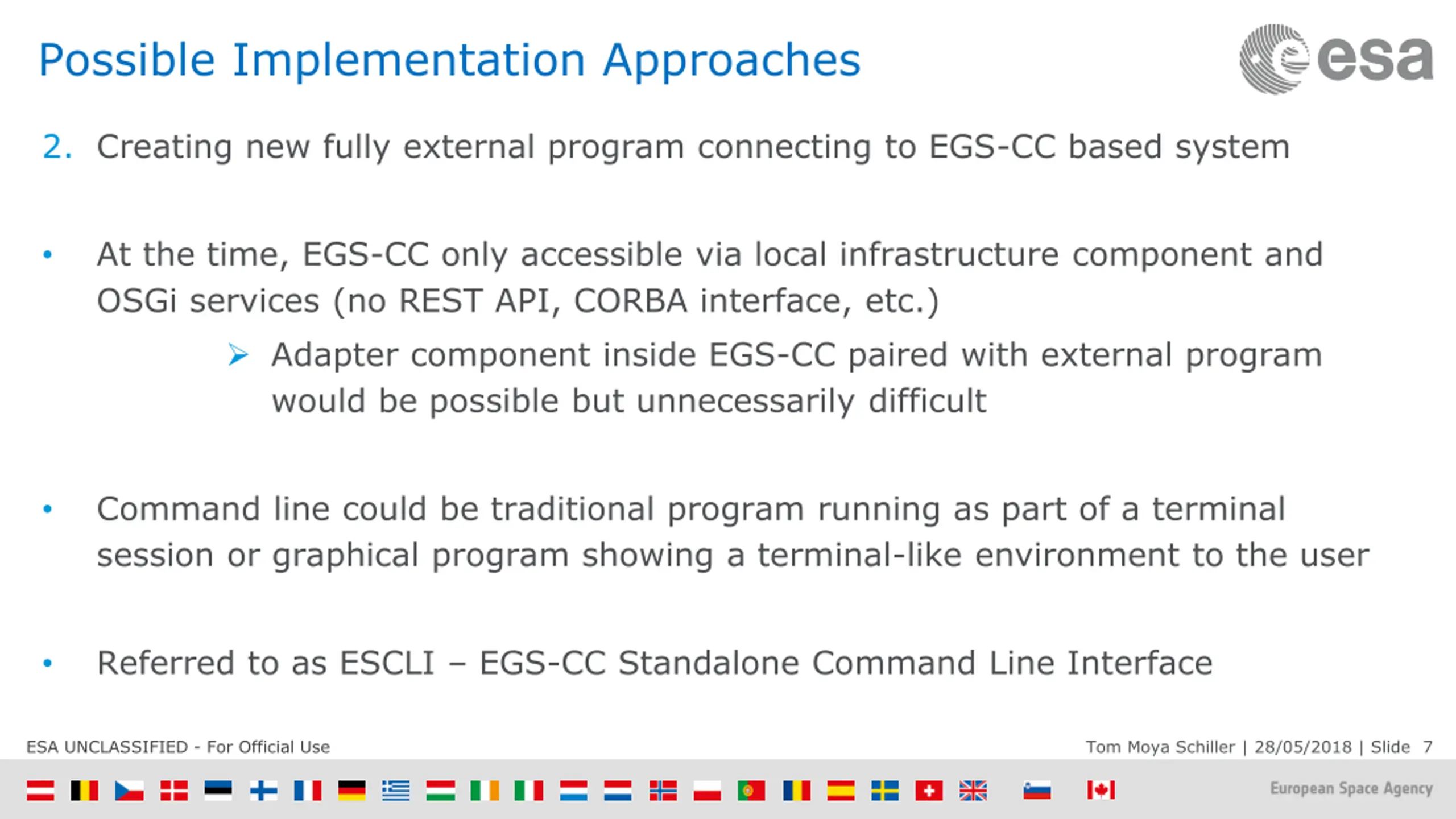 Possible Implementation Approaches 1. Expanding existing command line tool Script Execution Command Line already delivered as part of EGS-CC Component not directly interactive but started again for each command Simplifies automation using shell scripts, as commands can be called directly from operating system terminals Introduces unnecessary overhead, as each time new connection to EGS-CC backend established Ability to interactively access a running EGS-CC based system seen as too fundamental to go ahead using this component only ESA UNCLASSIFIED - For Official Use Tom Moya Schiller | 28/05/2018 | Slide 6