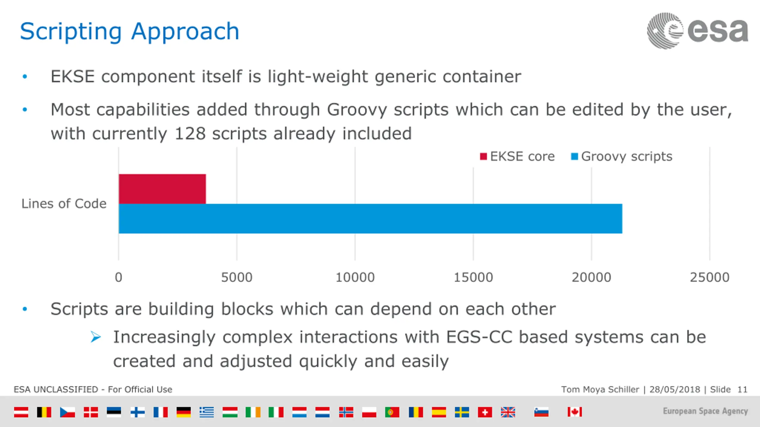 Scripting Approach EKSE component itself is light-weight generic container Most capabilities added through Groovy scripts which can be edited by the user, with currently 128 scripts already included EKSE core Groovy scripts Lines of Code 0 5000 10000 15000 20000 25000 Scripts are building blocks which can depend on each other Increasingly complex interactions with EGS-CC based systems can be created and adjusted quickly and easily ESA UNCLASSIFIED - For Official Use Tom Moya Schiller | 28/05/2018 | Slide 11