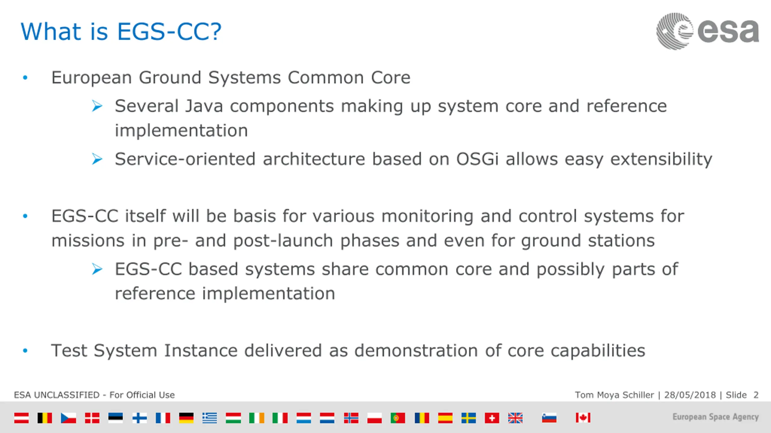 What is EGS-CC? European Ground Systems Common Core Several Java components making up system core and reference implementation Service-oriented architecture based on OSGi allows easy extensibility EGS-CC itself will be basis for various monitoring and control systems for missions in pre- and post-launch phases and even for ground stations EGS-CC based systems share common core and possibly parts of reference implementation Test System Instance delivered as demonstration of core capabilities ESA UNCLASSIFIED - For Official Use Tom Moya Schiller | 28/05/2018 | Slide 2
