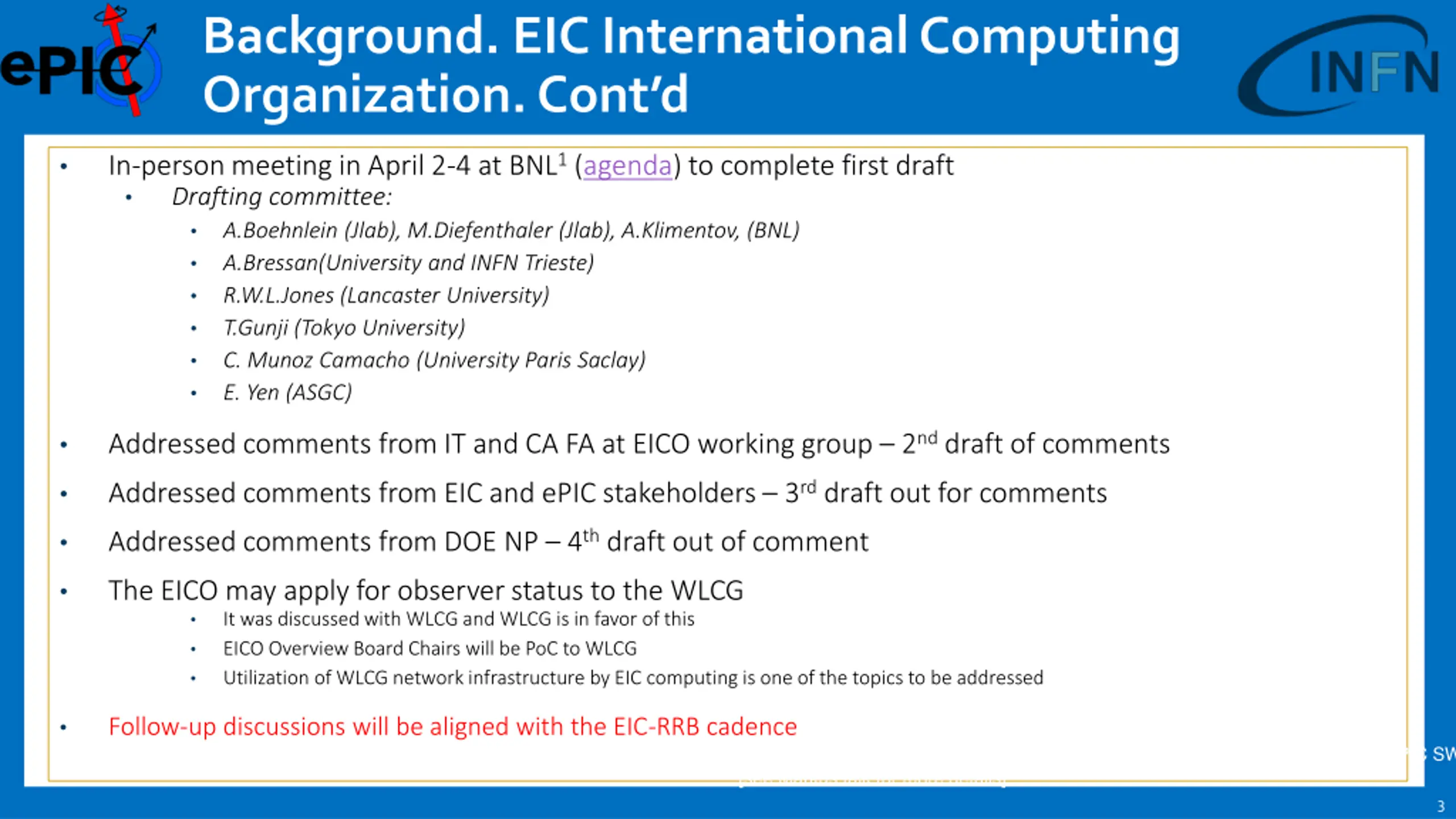 Background. EIC International Computing Organization. Cont d In-person meeting in April 2-4 at BNL1 (agenda) to complete first draft Drafting committee: A.Boehnlein (Jlab), M.Diefenthaler (Jlab), A.Klimentov, (BNL) A.Bressan(University and INFN Trieste) R.W.L.Jones (Lancaster University) T.Gunji (Tokyo University) C. Munoz Camacho (University Paris Saclay) E. Yen (ASGC) Addressed comments from IT and CA FA at EICO working group 2nd draft of comments Addressed comments from EIC and ePIC stakeholders 3rd draft out for comments Addressed comments from DOE NP 4th draft out of comment The EICO may apply for observer status to the WLCG It was discussed with WLCG and WLCG is in favor of this EICO Overview Board Chairs will be PoC to WLCG Utilization of WLCG network infrastructure by EIC computing is one of the topics to be addressed Follow-up discussions will be aligned with the EIC-RRB cadence 1the first day was co-located with Echelon0/1 mini-WS organized by ECSJI and ePIC SW&C [see Markus talk for more details] 3