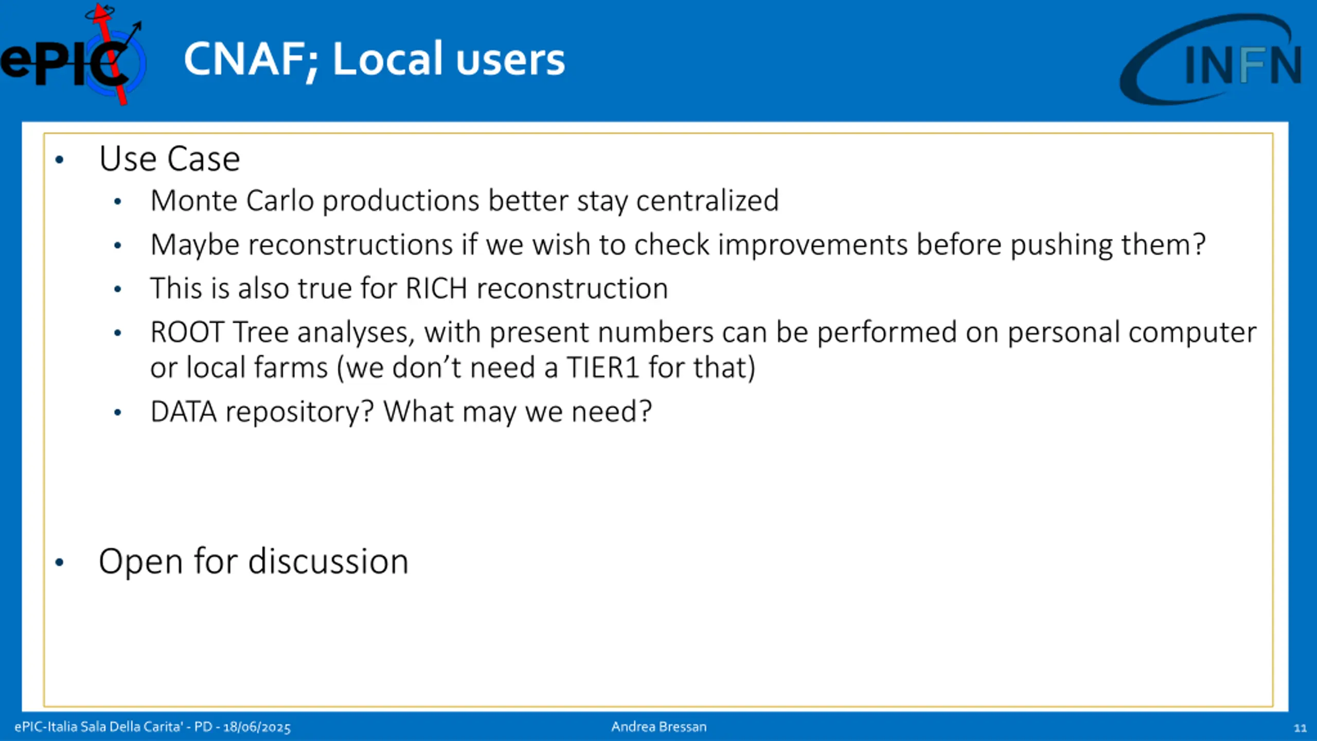 CNAF; Local users Use Case Monte Carlo productions better stay centralized Maybe reconstructions if we wish to check improvements before pushing them? This is also true for RICH reconstruction ROOT Tree analyses, with present numbers can be performed on personal computer or local farms (we don t need a TIER1 for that) DATA repository? What may we need? Open for discussion ePIC-Italia Sala Della Carita' - PD - 18/06/2025 Andrea Bressan 11