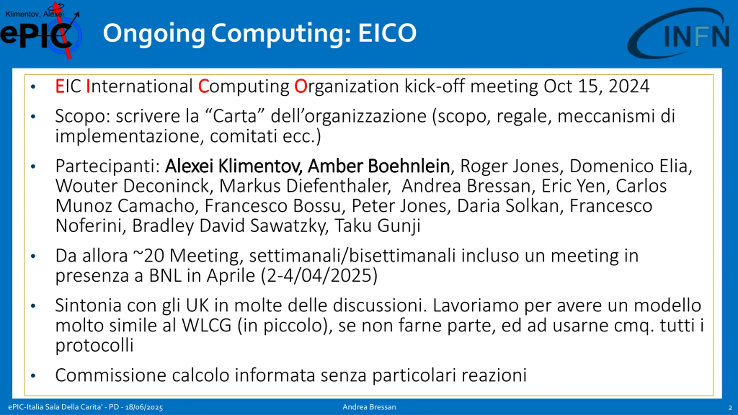 Klimentov, Alexei Ongoing Computing: EICO E EIC I International C Computing O Organization kick-off meeting Oct 15, 2024 Scopo: scrivere la Carta dell organizzazione (scopo, regale, meccanismi di implementazione, comitati ecc.) Partecipanti: Alexei Alexei Klimentov Klimentov, Amber , Amber Boehnlein Wouter Deconinck, Markus Diefenthaler, Andrea Bressan, Eric Yen, Carlos Munoz Camacho, Francesco Bossu, Peter Jones, Daria Solkan, Francesco Noferini, Bradley David Sawatzky, Taku Gunji Da allora ~20 Meeting, settimanali/bisettimanali incluso un meeting in presenza a BNL in Aprile (2-4/04/2025) Sintonia con gli UK in molte delle discussioni. Lavoriamo per avere un modello molto simile al WLCG (in piccolo), se non farne parte, ed ad usarne cmq. tutti i protocolli Commissione calcolo informata senza particolari reazioni Boehnlein, Roger Jones, Domenico Elia, ePIC-Italia Sala Della Carita' - PD - 18/06/2025 Andrea Bressan 2