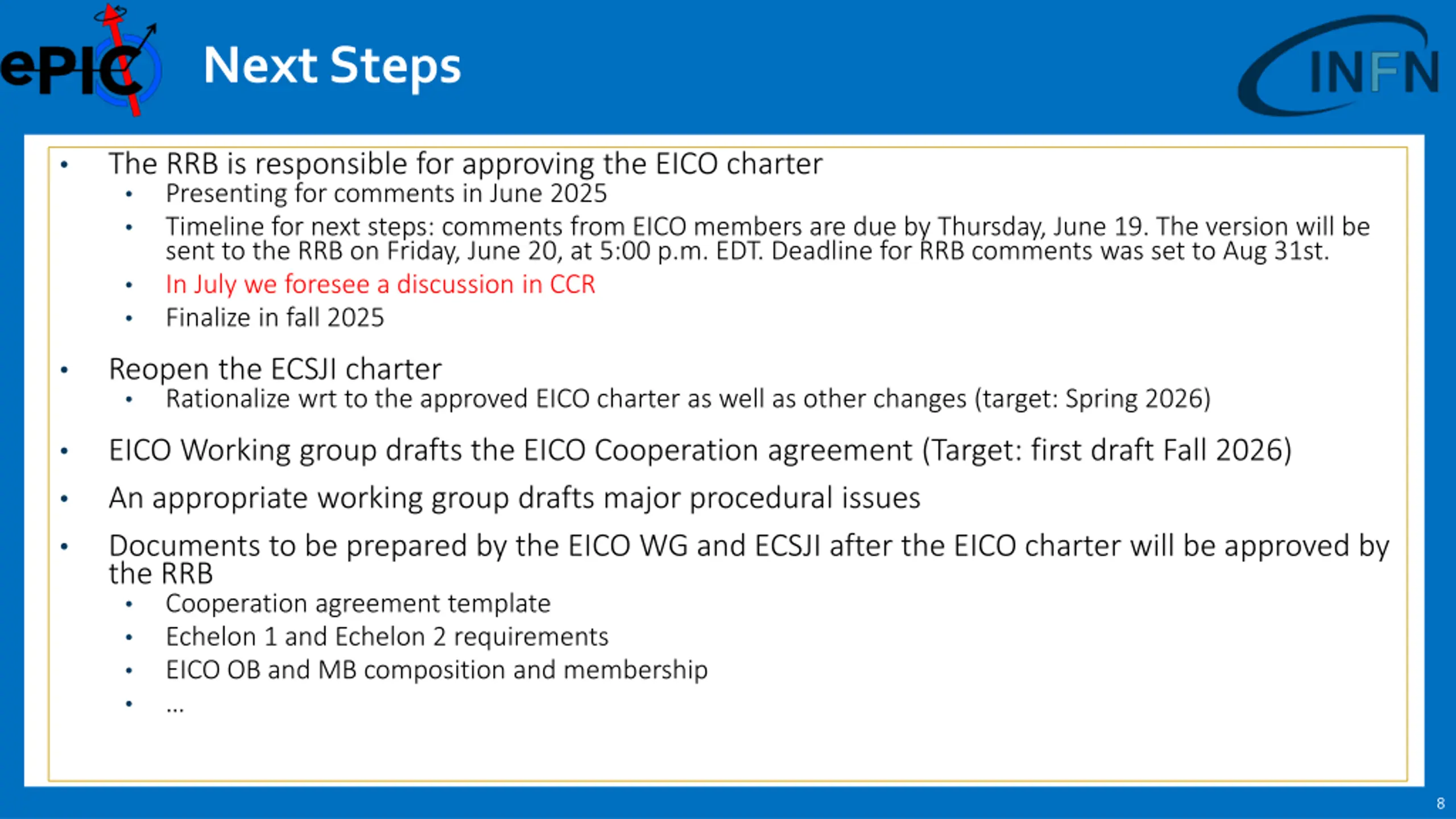 Next Steps The RRB is responsible for approving the EICO charter Presenting for comments in June 2025 Timeline for next steps: comments from EICO members are due by Thursday, June 19. The version will be sent to the RRB on Friday, June 20, at 5:00 p.m. EDT. Deadline for RRB comments was set to Aug 31st. In July we foresee a discussion in CCR Finalize in fall 2025 Reopen the ECSJI charter Rationalize wrt to the approved EICO charter as well as other changes (target: Spring 2026) EICO Working group drafts the EICO Cooperation agreement (Target: first draft Fall 2026) An appropriate working group drafts major procedural issues Documents to be prepared by the EICO WG and ECSJI after the EICO charter will be approved by the RRB Cooperation agreement template Echelon 1 and Echelon 2 requirements EICO OB and MB composition and membership 8