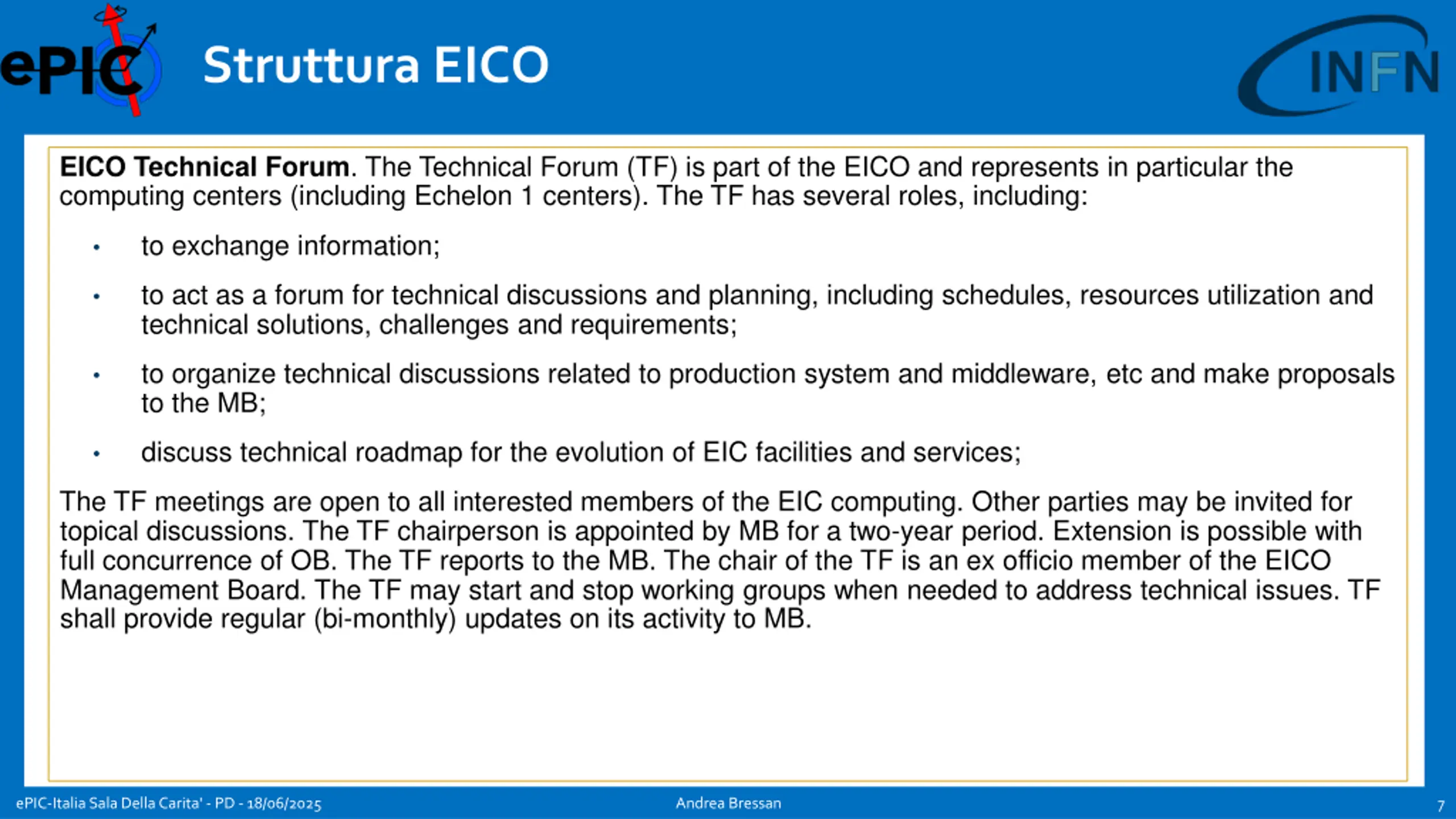 Struttura EICO EICO Technical Forum. The Technical Forum (TF) is part of the EICO and represents in particular the computing centers (including Echelon 1 centers). The TF has several roles, including: to exchange information; to act as a forum for technical discussions and planning, including schedules, resources utilization and technical solutions, challenges and requirements; to organize technical discussions related to production system and middleware, etc and make proposals to the MB; discuss technical roadmap for the evolution of EIC facilities and services; The TF meetings are open to all interested members of the EIC computing. Other parties may be invited for topical discussions. The TF chairperson is appointed by MB for a two-year period. Extension is possible with full concurrence of OB. The TF reports to the MB. The chair of the TF is an ex officio member of the EICO Management Board. The TF may start and stop working groups when needed to address technical issues. TF shall provide regular (bi-monthly) updates on its activity to MB. ePIC-Italia Sala Della Carita' - PD - 18/06/2025 Andrea Bressan 7