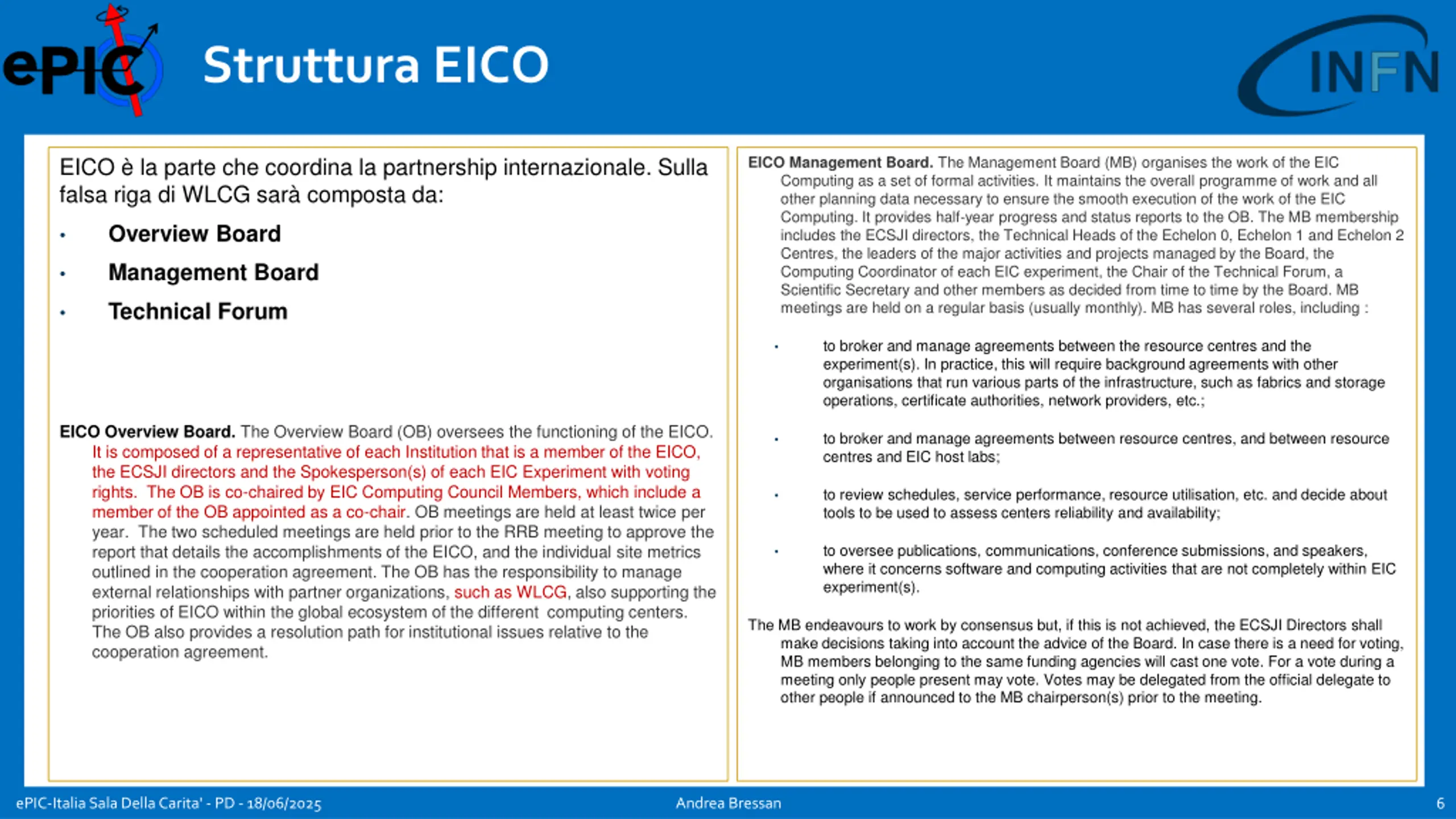 Struttura EICO EICO Management Board. The Management Board (MB) organises the work of the EIC Computing as a set of formal activities. It maintains the overall programme of work and all other planning data necessary to ensure the smooth execution of the work of the EIC Computing. It provides half-year progress and status reports to the OB. The MB membership includes the ECSJI directors, the Technical Heads of the Echelon 0, Echelon 1 and Echelon 2 Centres, the leaders of the major activities and projects managed by the Board, the Computing Coordinator of each EIC experiment, the Chair of the Technical Forum, a Scientific Secretary and other members as decided from time to time by the Board. MB meetings are held on a regular basis (usually monthly). MB has several roles, including : EICO la parte che coordina la partnership internazionale. Sulla falsa riga di WLCG sar composta da: Overview Board Management Board Technical Forum to broker and manage agreements between the resource centres and the experiment(s). In practice, this will require background agreements with other organisations that run various parts of the infrastructure, such as fabrics and storage operations, certificate authorities, network providers, etc.; EICO Overview Board. The Overview Board (OB) oversees the functioning of the EICO. It is composed of a representative of each Institution that is a member of the EICO, the ECSJI directors and the Spokesperson(s) of each EIC Experiment with voting rights. The OB is co-chaired by EIC Computing Council Members, which include a member of the OB appointed as a co-chair. OB meetings are held at least twice per year. The two scheduled meetings are held prior to the RRB meeting to approve the report that details the accomplishments of the EICO, and the individual site metrics outlined in the cooperation agreement. The OB has the responsibility to manage external relationships with partner organizations, such as WLCG, also supporting the priorities of EICO within the global ecosystem of the different computing centers. The OB also provides a resolution path for institutional issues relative to the cooperation agreement. to broker and manage agreements between resource centres, and between resource centres and EIC host labs; to review schedules, service performance, resource utilisation, etc. and decide about tools to be used to assess centers reliability and availability; to oversee publications, communications, conference submissions, and speakers, where it concerns software and computing activities that are not completely within EIC experiment(s). The MB endeavours to work by consensus but, if this is not achieved, the ECSJI Directors shall make decisions taking into account the advice of the Board. In case there is a need for voting, MB members belonging to the same funding agencies will cast one vote. For a vote during a meeting only people present may vote. Votes may be delegated from the official delegate to other people if announced to the MB chairperson(s) prior to the meeting. ePIC-Italia Sala Della Carita' - PD - 18/06/2025 Andrea Bressan 6
