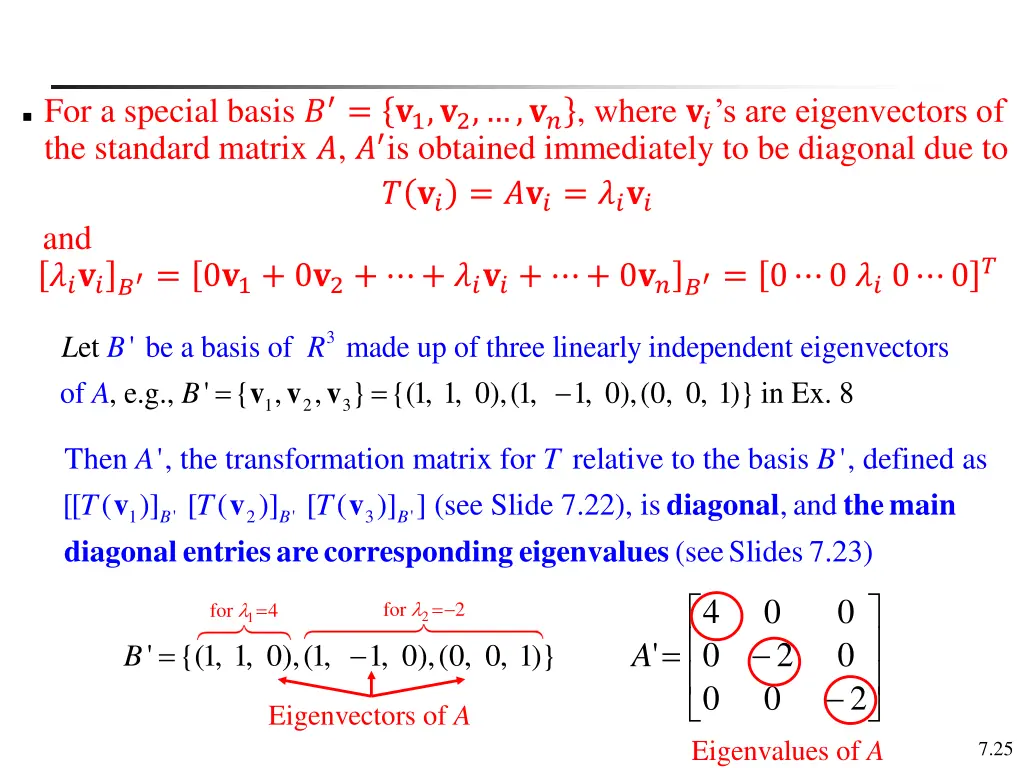For a special basis ?= ?1,?2,,??, where ??s are eigenvectors of the standard matrix ?, ? is obtained immediately to be diagonal due to ? ?? = ???= ???? and ???? ? = 0?1+ 0?2+ + ????+ + 0?? ? = 0 0 ??0 0? 3 et f ' be a basis of , e.g., ' { , B A made up of three linearly independent eigenvect } {(1, 1, 0),(1, 1, 0),(0 = v v v ors L B R = o , , 0, 1)} in Ex 8 . 1 2 3 Then ', the transformation matrix for relative to the basis ', defined as [[ ( )] [ ( )] [ ( )] ] (see Slide 7.22), is B B B T T T v v v diagonal entries are corresponding eigenvalues(see Slides 7.23) A T B diagonal the main , and 1 ' 2 ' 3 ' 4 0 0 = = for 2 for 4 2 1 = ' A 0 2 0 ' {(1, 1, 0),(1, 1, 0),(0, 0, 1)} B = 0 0 2 Eigenvectors of A Eigenvalues of A 7.25
