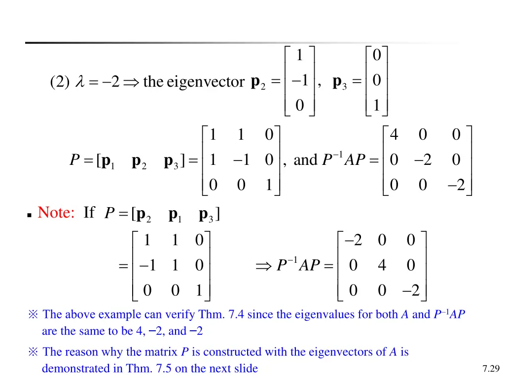 1 0 0 1 = = p p = 1 , 0 (2) 2 the eigenvector 2 3 1 1 0 1 0 4 0 0 0 0 0 = = = 1 p p p [ ] 1 0 , and 0 1 2 P P AP 1 2 3 0 2 = p p p Note: If [ ] P 2 1 3 1 1 0 0 1 2 0 4 0 0 0 = = 1 1 1 0 0 0 P AP 0 2 The above example can verify Thm. 7.4 since the eigenvalues for both A and P 1AP are the same to be 4, 2, and 2 The reason why the matrix P is constructed with the eigenvectors of A is demonstrated in Thm. 7.5 on the next slide 7.29