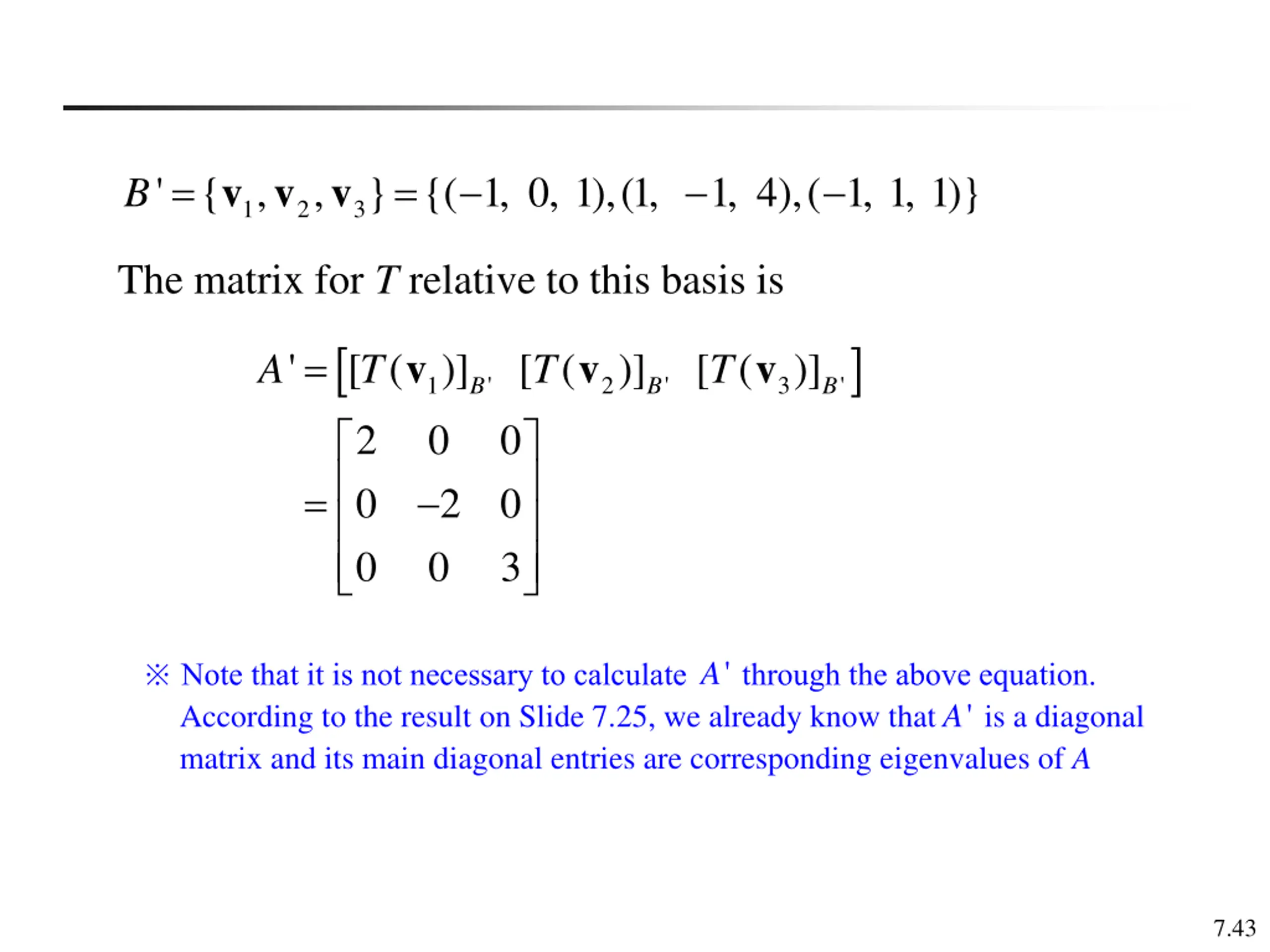 ' { , B = } {( 1, 0, 1),(1, 1, 4),( 1, 1, 1)} = v v v , 1 2 3 The matrix for T relative to this basis is = v v v ' [ ( T )] [ ( B )] [ ( B )] A T T 1 0 ' 2 ' 3 ' B 2 0 0 0 0 3 = 2 0 ' A Note that it is not necessary to calculate through the above equation. According to the result on Slide 7.25, we already know that matrix and its main diagonal entries are corresponding eigenvalues of A ' A is a diagonal 7.43
