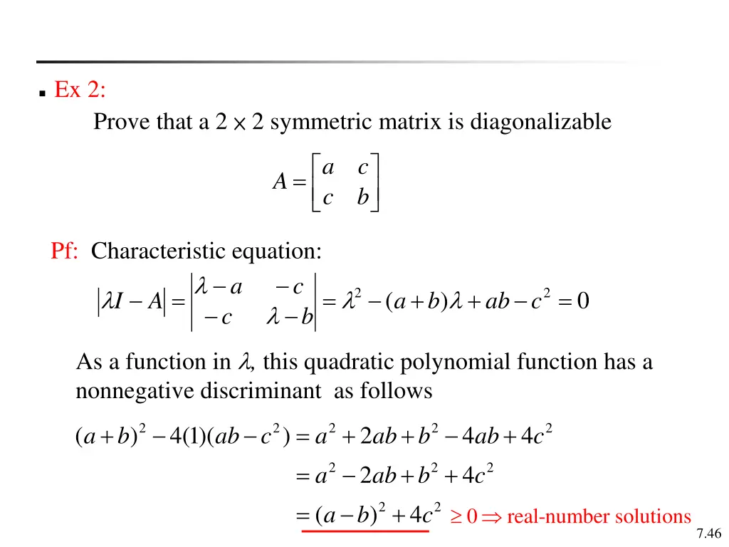 Ex 2: Prove that a 2 2 symmetric matrix is diagonalizable a c = A c b Pf: Characteristic equation: a c = = + + = 2 2 ( ) 0 I A a b ab c c b As a function in , this quadratic polynomial function has a nonnegative discriminant as follows a b + = = = + + + + 2 2 2 2 2 ( ) 4(1)( ) 2 2 4 4 4 ab c a a ab b ab b + + ab c c 2 2 2 a b 2 2 ( ) 4 c 0 real-number solutions 7.46
