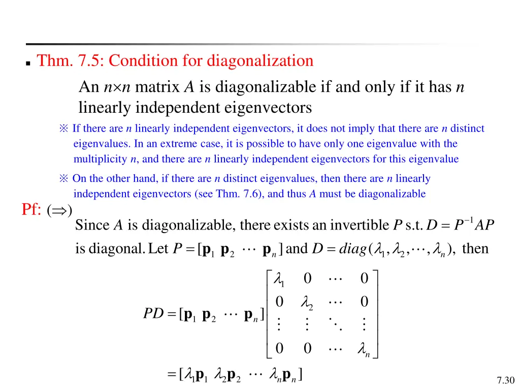 Thm. 7.5: Condition for diagonalization An n n matrix A is diagonalizable if and only if it has n linearly independent eigenvectors If there are n linearly independent eigenvectors, it does not imply that there are n distinct eigenvalues. In an extreme case, it is possible to have only one eigenvalue with the multiplicity n, and there are n linearly independent eigenvectors for this eigenvalue On the other hand, if there are n distinct eigenvalues, then there are n linearly independent eigenvectors (see Thm. 7.6), and thus A must be diagonalizable Pf: ( ) = 1 Since is diagonalizable, there exists an invertible s.t. is diagonal. Let [ P = p p A P D P AP = diag p ] and ( , , , ), then D 1 2 1 2 n n 0 0 0 1 0 2 = p p p [ ] PD 1 2 n 0 0 n = 1 1 p p p [ ] 2 2 n n 7.30