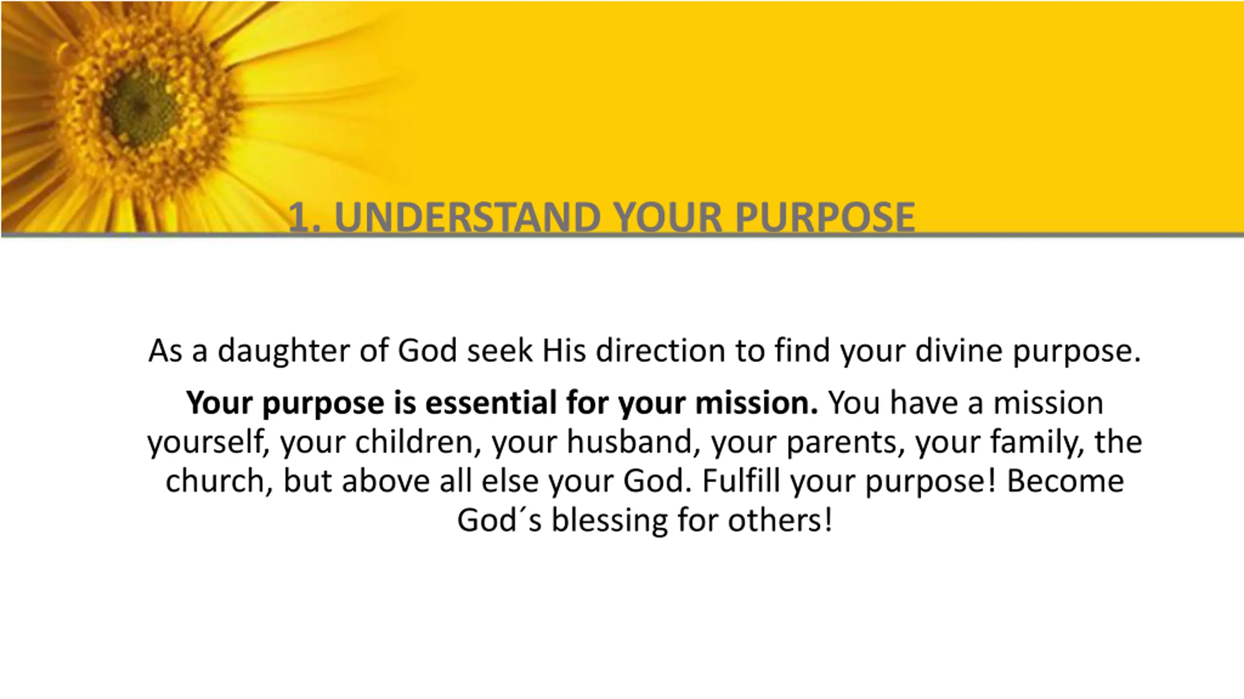 1. UNDERSTAND YOUR PURPOSE As a daughter of God seek His direction to find your divine purpose. Your purpose is essential for your mission. You have a mission yourself, your children, your husband, your parents, your family, the church, but above all else your God. Fulfill your purpose! Become God s blessing for others!