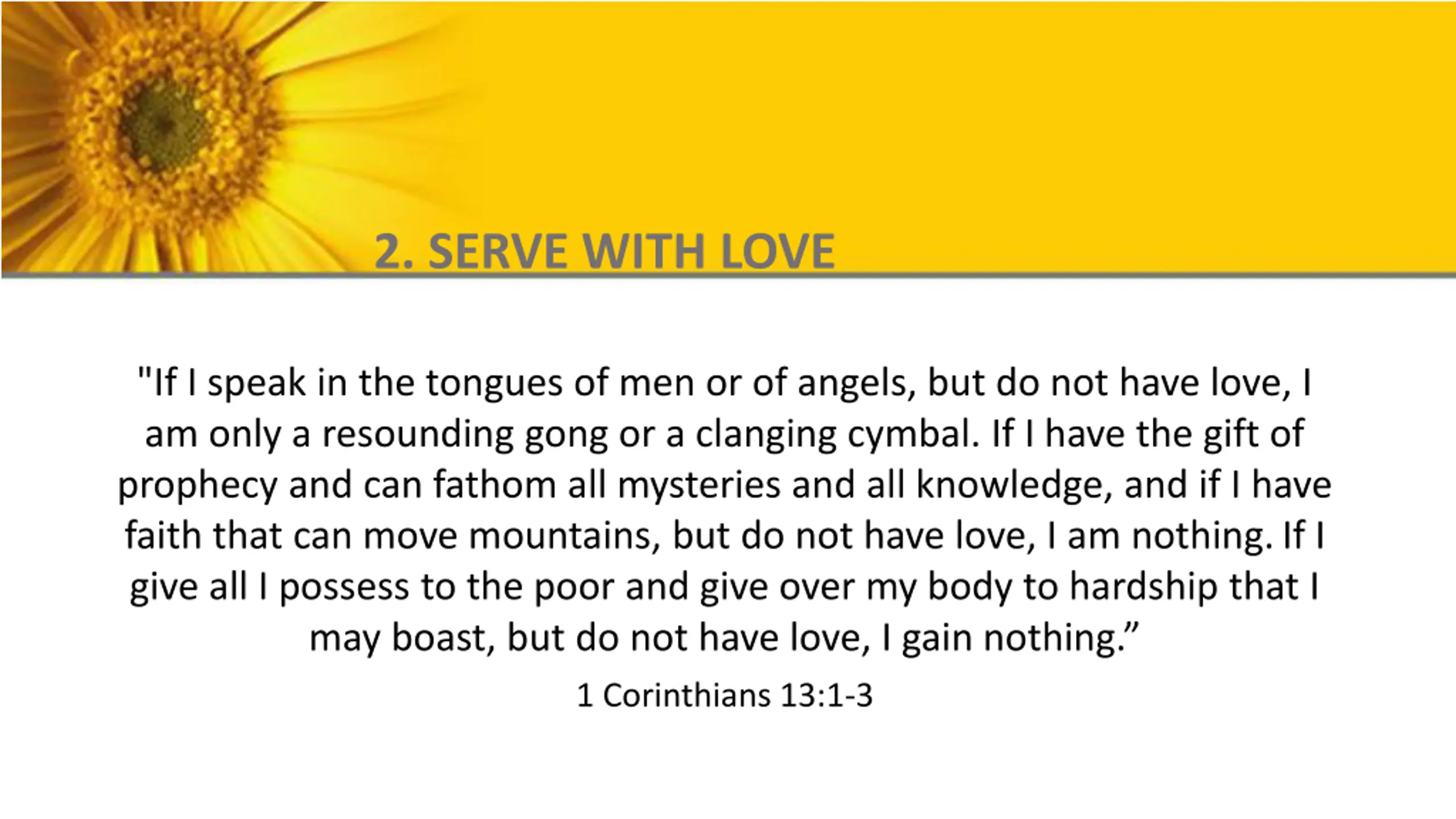 2. SERVE WITH LOVE "If I speak in the tongues of men or of angels, but do not have love, I am only a resounding gong or a clanging cymbal. If I have the gift of prophecy and can fathom all mysteries and all knowledge, and if I have faith that can move mountains, but do not have love, I am nothing.If I give all I possess to the poor and give over my body to hardship that I may boast, but do not have love, I gain nothing. 1 Corinthians 13:1-3