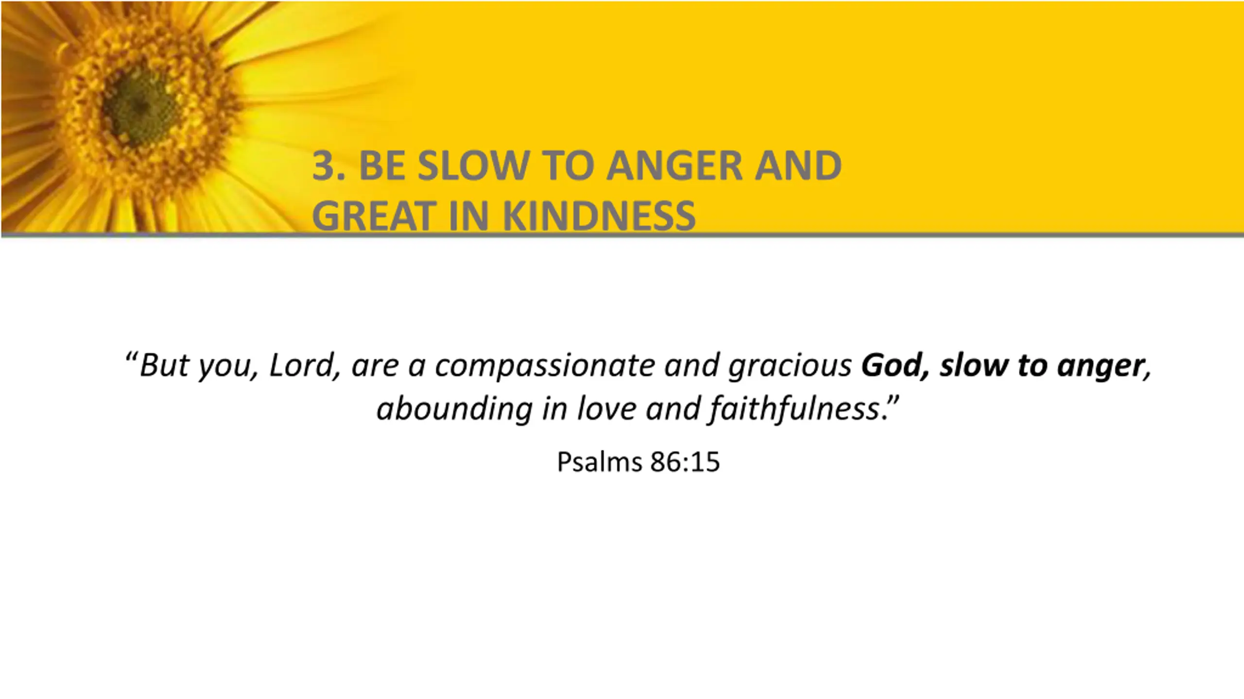3. BE SLOW TO ANGER AND GREAT IN KINDNESS But you, Lord, are a compassionate and gracious God, slow to anger, abounding in love and faithfulness. Psalms 86:15
