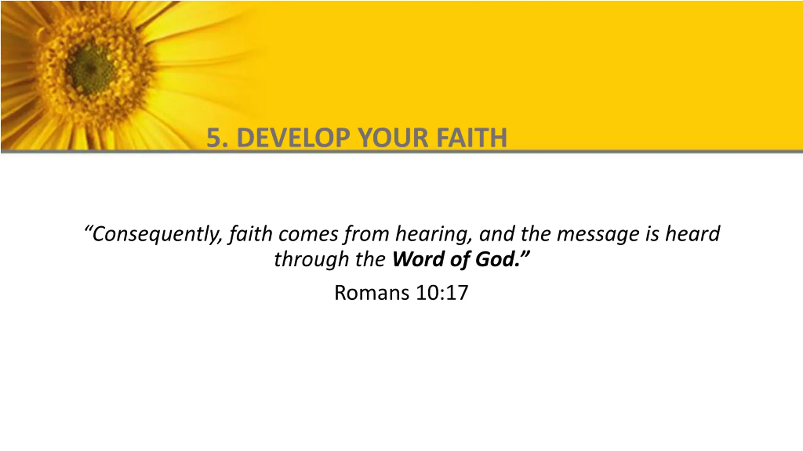 5. DEVELOP YOUR FAITH Consequently, faith comes from hearing, and the message is heard through the Word of God. Romans 10:17