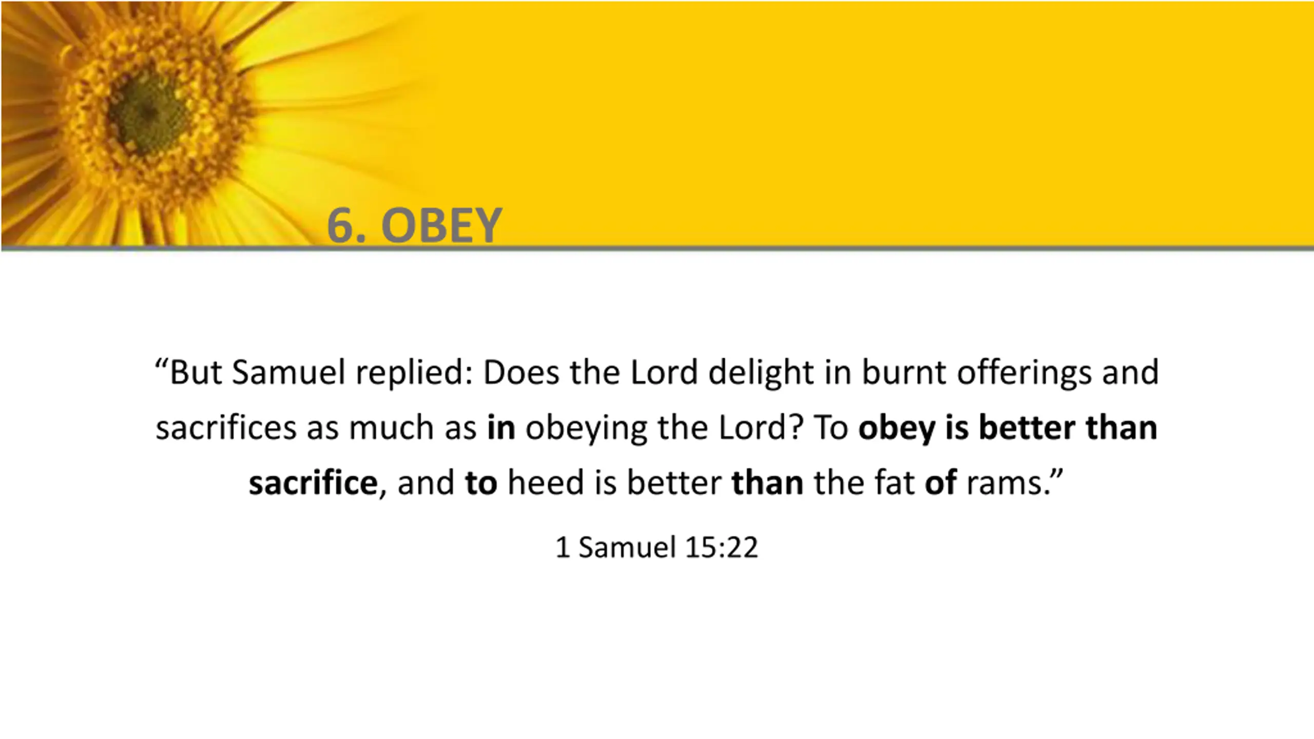 6. OBEY But Samuel replied: Does the Lord delight in burnt offerings and sacrifices as much as in obeying the Lord? To obey is better than sacrifice, and to heed is better than the fat of rams. 1 Samuel 15:22
