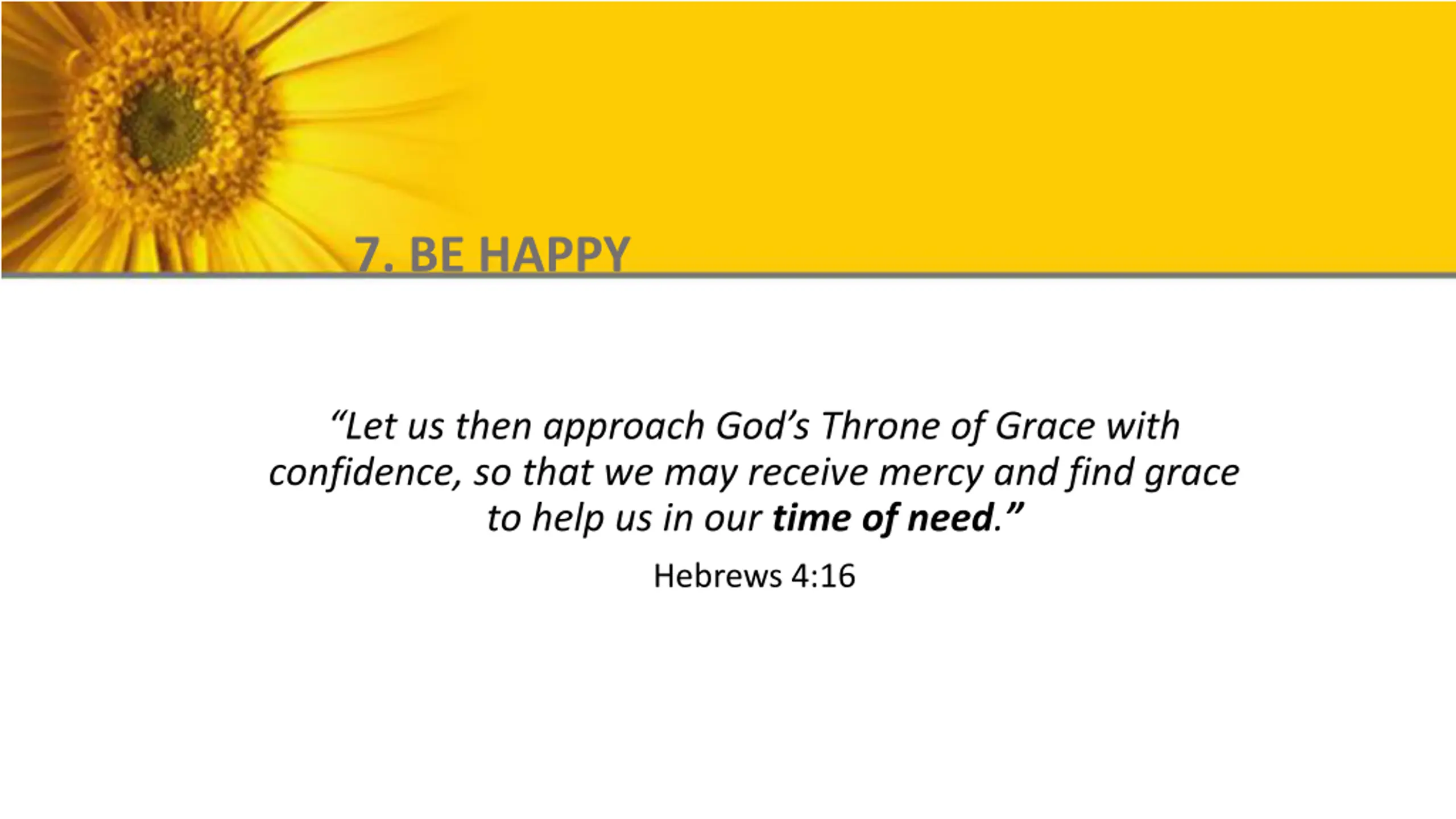 7. BE HAPPY Let us then approach God s Throne of Grace with confidence, so that we may receive mercy and find grace to help us in our time of need. Hebrews 4:16