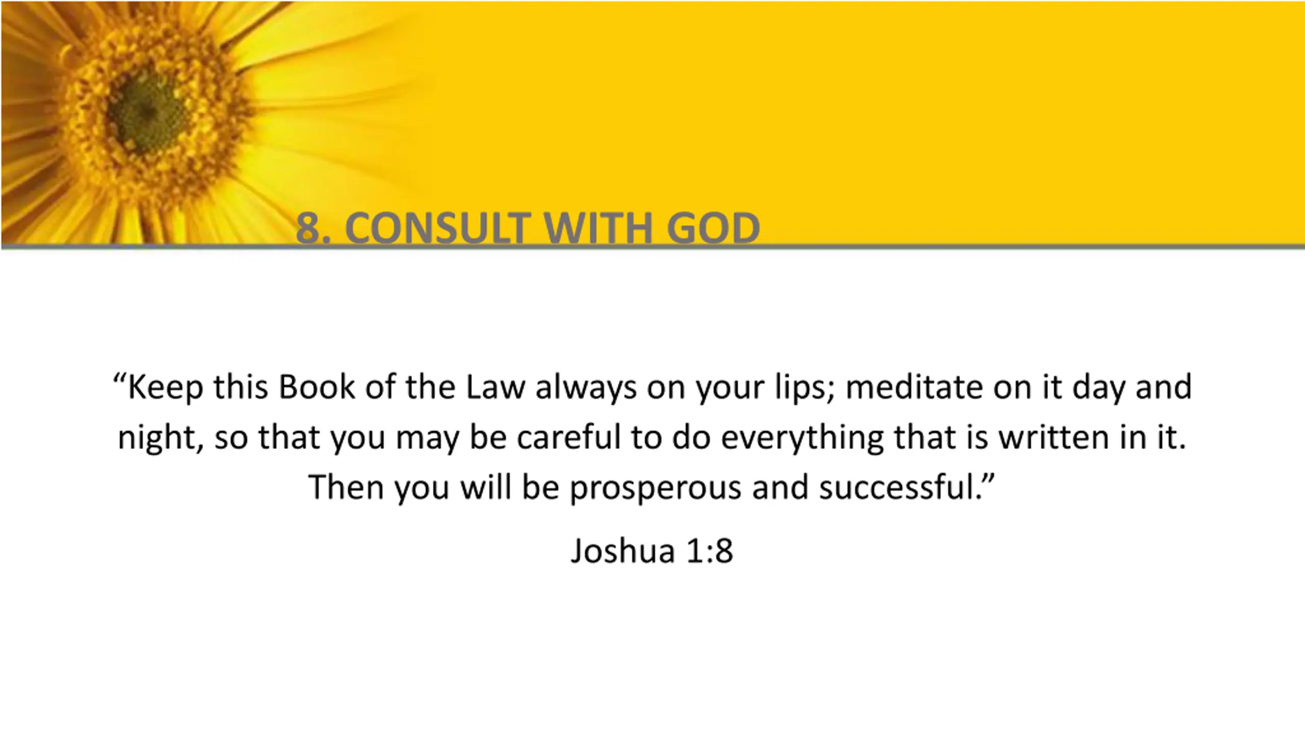 8. CONSULT WITH GOD Keep this Book of the Law always on your lips; meditate on it day and night, so that you may be careful to do everything that is written in it. Then you will be prosperous and successful. Joshua 1:8
