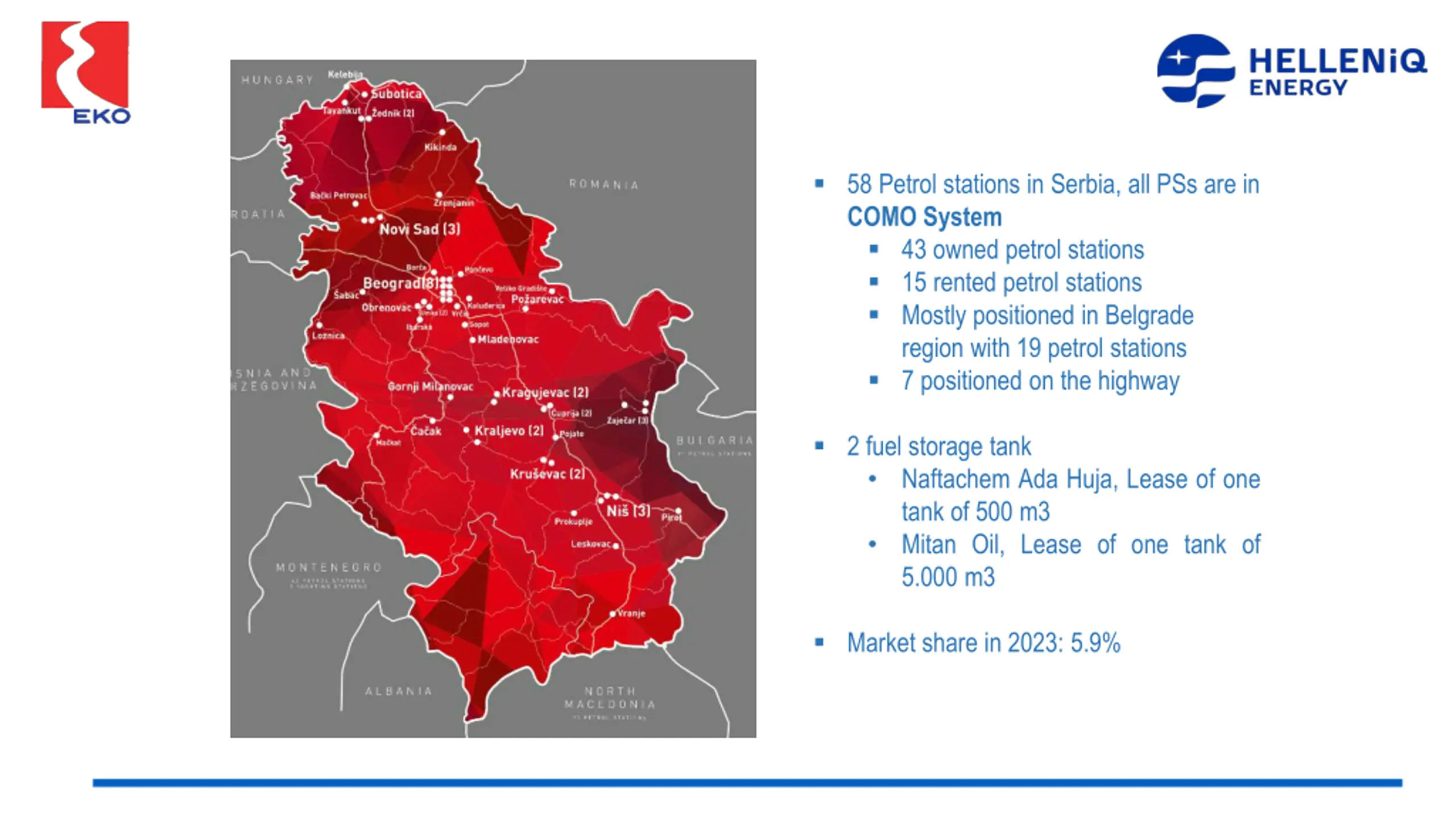 58 Petrol stations in Serbia, all PSs are in COMO System 43 owned petrol stations 15 rented petrol stations Mostly positioned in Belgrade region with 19 petrol stations 7 positioned on the highway 2 fuel storage tank Naftachem Ada Huja, Lease of one tank of 500 m3 Mitan Oil, Lease of one tank of 5.000 m3 Market share in 2023: 5.9%