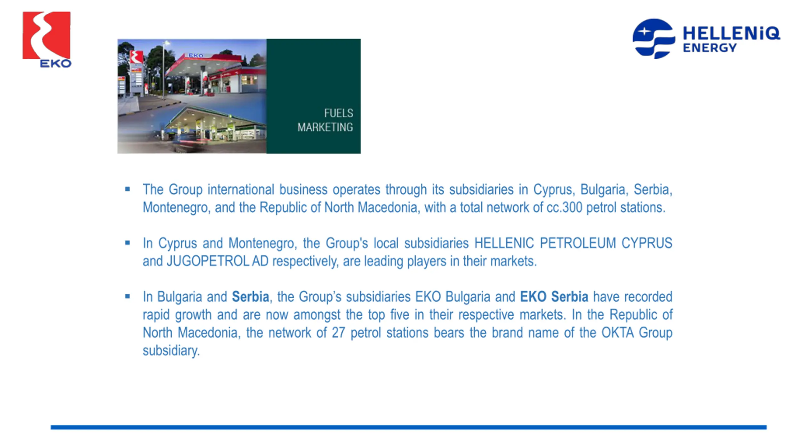 http://www.helpe.gr/userfiles/8a53b155-76e9-4d45-9773-a27000e44a36/lianiki-emporia-en.pnghttp://www.helpe.gr/userfiles/8a53b155-76e9-4d45-9773-a27000e44a36/lianiki-emporia-en.png The Group international business operates through its subsidiaries in Cyprus, Bulgaria, Serbia, Montenegro, and the Republic of North Macedonia, with a total network of cc.300 petrol stations. In Cyprus and Montenegro, the Group's local subsidiaries HELLENIC PETROLEUM CYPRUS and JUGOPETROLAD respectively, are leading players in their markets. In Bulgaria and Serbia, the Group s subsidiaries EKO Bulgaria and EKO Serbia have recorded rapid growth and are now amongst the top five in their respective markets. In the Republic of North Macedonia, the network of 27 petrol stations bears the brand name of the OKTA Group subsidiary.