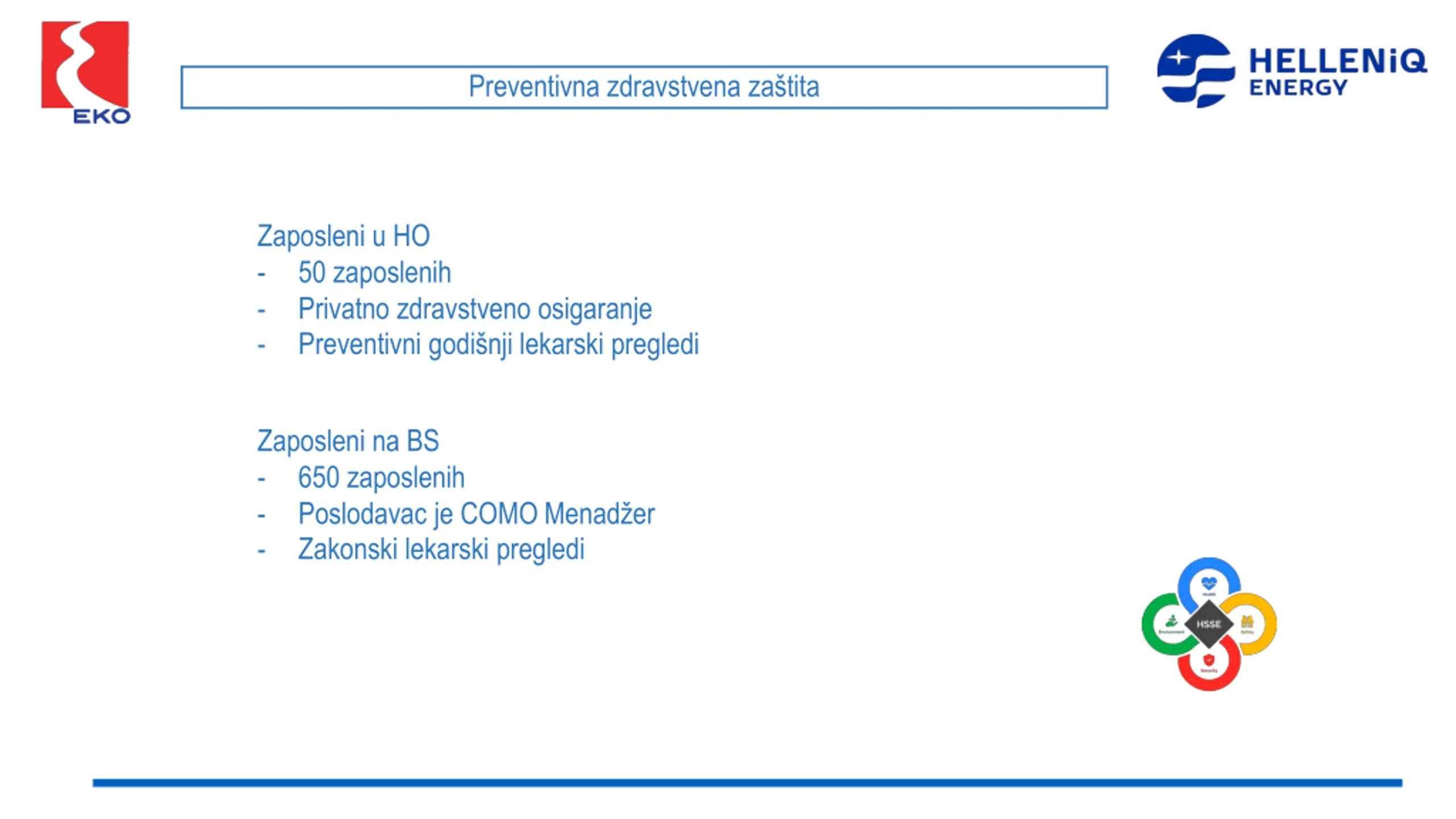 Preventivna zdravstvena zatita Zaposleni u HO - 50 zaposlenih - Privatno zdravstveno osigaranje - Preventivni godi nji lekarski pregledi Zaposleni na BS - 650 zaposlenih - Poslodavac je COMO Menad er - Zakonski lekarski pregledi
