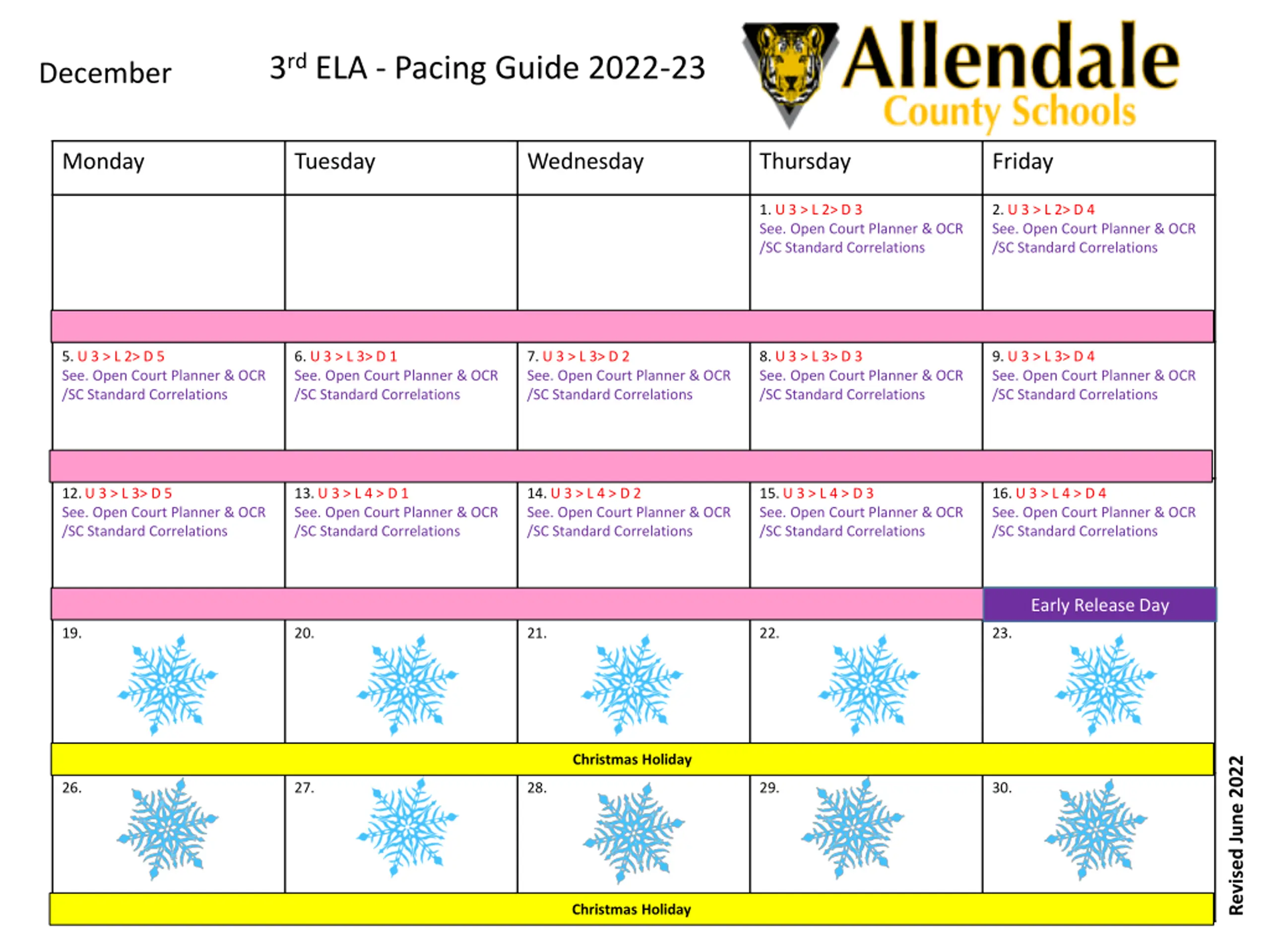 3rd ELA - Pacing Guide 2022-23 December Monday Tuesday Wednesday Thursday Friday 1. U 3 > L 2> D 3 See. Open Court Planner & OCR /SC Standard Correlations 2. U 3 > L 2> D 4 See. Open Court Planner & OCR /SC Standard Correlations 5. U 3 > L 2> D 5 See. Open Court Planner & OCR /SC Standard Correlations 6. U 3 > L 3> D 1 See. Open Court Planner & OCR /SC Standard Correlations 7. U 3 > L 3> D 2 See. Open Court Planner & OCR /SC Standard Correlations 8. U 3 > L 3> D 3 See. Open Court Planner & OCR /SC Standard Correlations 9. U 3 > L 3> D 4 See. Open Court Planner & OCR /SC Standard Correlations 12.U 3 > L 3> D 5 See. Open Court Planner & OCR /SC Standard Correlations 13. U 3 > L 4 > D 1 See. Open Court Planner & OCR /SC Standard Correlations 14. U 3 > L 4 > D 2 See. Open Court Planner & OCR /SC Standard Correlations 15. U 3 > L 4 > D 3 See. Open Court Planner & OCR /SC Standard Correlations 16. U 3 > L 4 > D 4 See. Open Court Planner & OCR /SC Standard Correlations Early Release Day 19. 20. 21. 22. 23. Christmas Holiday Revised June 2022 26. 27. 28. 29. 30. Christmas Holiday