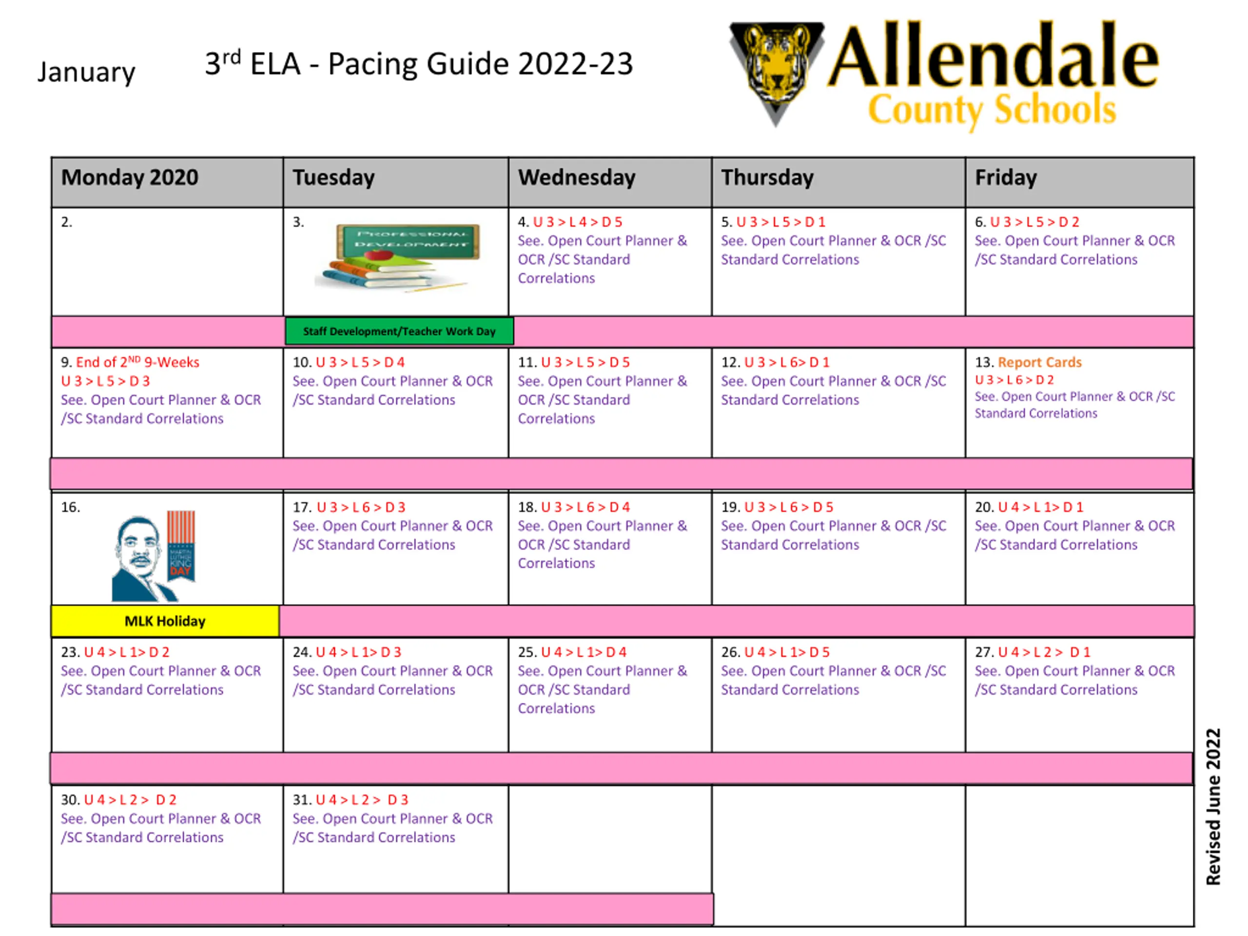 3rd ELA - Pacing Guide 2022-23 January Monday 2020 Tuesday Wednesday Thursday Friday 2. 3. 4. U 3 > L 4 > D 5 See. Open Court Planner & OCR /SC Standard Correlations 5. U 3 > L 5 > D 1 See. Open Court Planner & OCR /SC Standard Correlations 6. U 3 > L 5 > D 2 See. Open Court Planner & OCR /SC Standard Correlations Staff Development/Teacher Work Day 9. End of 2ND 9-Weeks U 3 > L 5 > D 3 See. Open Court Planner & OCR /SC Standard Correlations 10. U 3 > L 5 > D 4 See. Open Court Planner & OCR /SC Standard Correlations 11. U 3 > L 5 > D 5 See. Open Court Planner & OCR /SC Standard Correlations 12. U 3 > L 6> D 1 See. Open Court Planner & OCR /SC Standard Correlations 13. Report Cards U 3 > L 6 > D 2 See. Open Court Planner & OCR /SC Standard Correlations 17.U 3 > L 6 > D 3 See. Open Court Planner & OCR /SC Standard Correlations 16. 18. U 3 > L 6 > D 4 See. Open Court Planner & OCR /SC Standard Correlations 19. U 3 > L 6 > D 5 See. Open Court Planner & OCR /SC Standard Correlations 20. U 4 > L 1> D 1 See. Open Court Planner & OCR /SC Standard Correlations MLK Holiday 23. U 4 > L 1> D 2 See. Open Court Planner & OCR /SC Standard Correlations 24. U 4 > L 1> D 3 See. Open Court Planner & OCR /SC Standard Correlations 25. U 4 > L 1> D 4 See. Open Court Planner & OCR /SC Standard Correlations 26. U 4 > L 1> D 5 See. Open Court Planner & OCR /SC Standard Correlations 27. U 4 > L 2 > D 1 See. Open Court Planner & OCR /SC Standard Correlations Revised June 2022 30. U 4 > L 2 > D 2 See. Open Court Planner & OCR /SC Standard Correlations 31. U 4 > L 2 > D 3 See. Open Court Planner & OCR /SC Standard Correlations