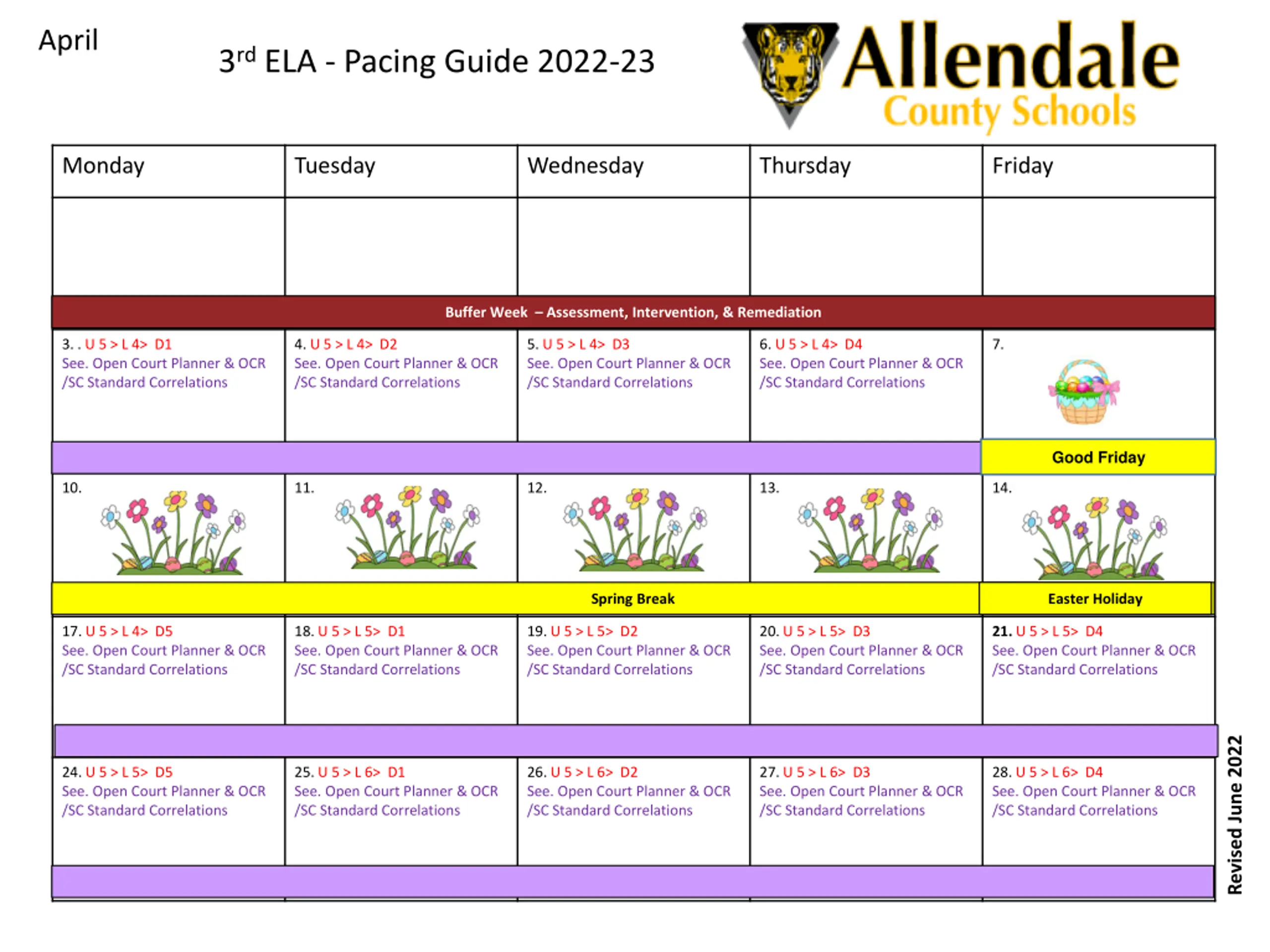 April 3rd ELA - Pacing Guide 2022-23 Monday Tuesday Wednesday Thursday Friday Buffer Week Assessment, Intervention, & Remediation 3. . U 5 > L 4> D1 See. Open Court Planner & OCR /SC Standard Correlations 4. U 5 > L 4> D2 See. Open Court Planner & OCR /SC Standard Correlations 5. U 5 > L 4> D3 See. Open Court Planner & OCR /SC Standard Correlations 6. U 5 > L 4> D4 See. Open Court Planner & OCR /SC Standard Correlations 7. Good Friday 10. 11. 12. 13. 14. Spring Break Easter Holiday 17. U 5 > L 4> D5 See. Open Court Planner & OCR /SC Standard Correlations 18. U 5 > L 5> D1 See. Open Court Planner & OCR /SC Standard Correlations 19. U 5 > L 5> D2 See. Open Court Planner & OCR /SC Standard Correlations 20. U 5 > L 5> D3 See. Open Court Planner & OCR /SC Standard Correlations 21. U 5 > L 5> D4 See. Open Court Planner & OCR /SC Standard Correlations Revised June 2022 24. U 5 > L 5> D5 See. Open Court Planner & OCR /SC Standard Correlations 25. U 5 > L 6> D1 See. Open Court Planner & OCR /SC Standard Correlations 26. U 5 > L 6> D2 See. Open Court Planner & OCR /SC Standard Correlations 27. U 5 > L 6> D3 See. Open Court Planner & OCR /SC Standard Correlations 28. U 5 > L 6> D4 See. Open Court Planner & OCR /SC Standard Correlations