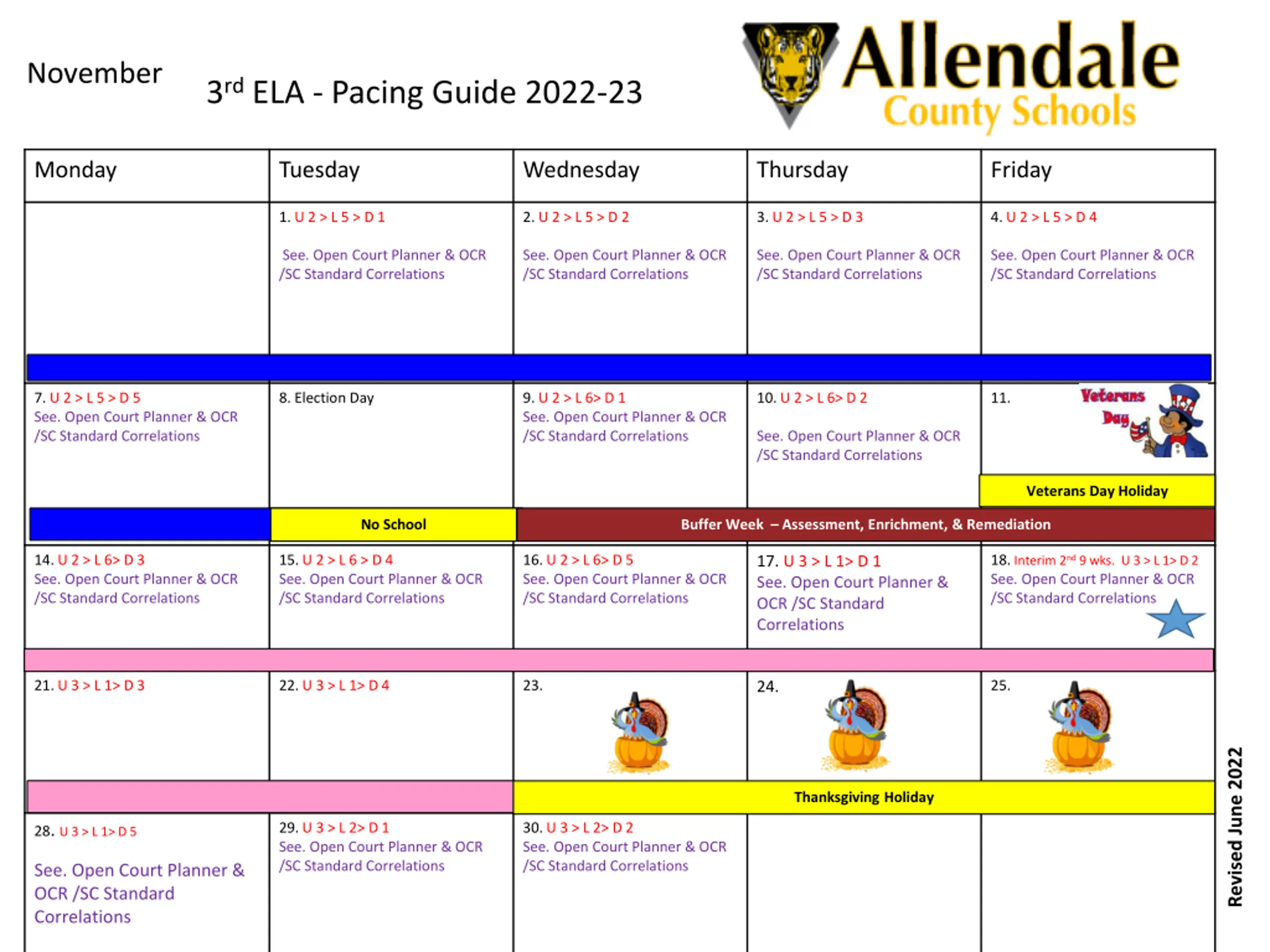 November 3rd ELA - Pacing Guide 2022-23 Monday Tuesday Wednesday Thursday Friday 1. U 2 > L 5 > D 1 2. U 2 > L 5 > D 2 3. U 2 > L 5 > D 3 4. U 2 > L 5 > D 4 See. Open Court Planner & OCR /SC Standard Correlations See. Open Court Planner & OCR /SC Standard Correlations See. Open Court Planner & OCR /SC Standard Correlations See. Open Court Planner & OCR /SC Standard Correlations 7. U 2 > L 5 > D 5 See. Open Court Planner & OCR /SC Standard Correlations 8. Election Day 9. U 2 > L 6> D 1 See. Open Court Planner & OCR /SC Standard Correlations 10. U 2 > L 6> D 2 11. See. Open Court Planner & OCR /SC Standard Correlations Veterans Day Holiday No School Buffer Week Assessment, Enrichment, & Remediation 14. U 2 > L 6> D 3 See. Open Court Planner & OCR /SC Standard Correlations 15. U 2 > L 6 > D 4 See. Open Court Planner & OCR /SC Standard Correlations 16. U 2 > L 6> D 5 See. Open Court Planner & OCR /SC Standard Correlations 18. Interim 2nd 9 wks. U 3 > L 1> D 2 See. Open Court Planner & OCR /SC Standard Correlations 17. U 3 > L 1> D 1 See. Open Court Planner & OCR /SC Standard Correlations 21. U 3 > L 1> D 3 22. U 3 > L 1> D 4 23. 25. 24. Revised June 2022 Thanksgiving Holiday 29. U 3 > L 2> D 1 See. Open Court Planner & OCR /SC Standard Correlations 30. U 3 > L 2> D 2 See. Open Court Planner & OCR /SC Standard Correlations 28. U 3 > L 1> D 5 See. Open Court Planner & OCR /SC Standard Correlations