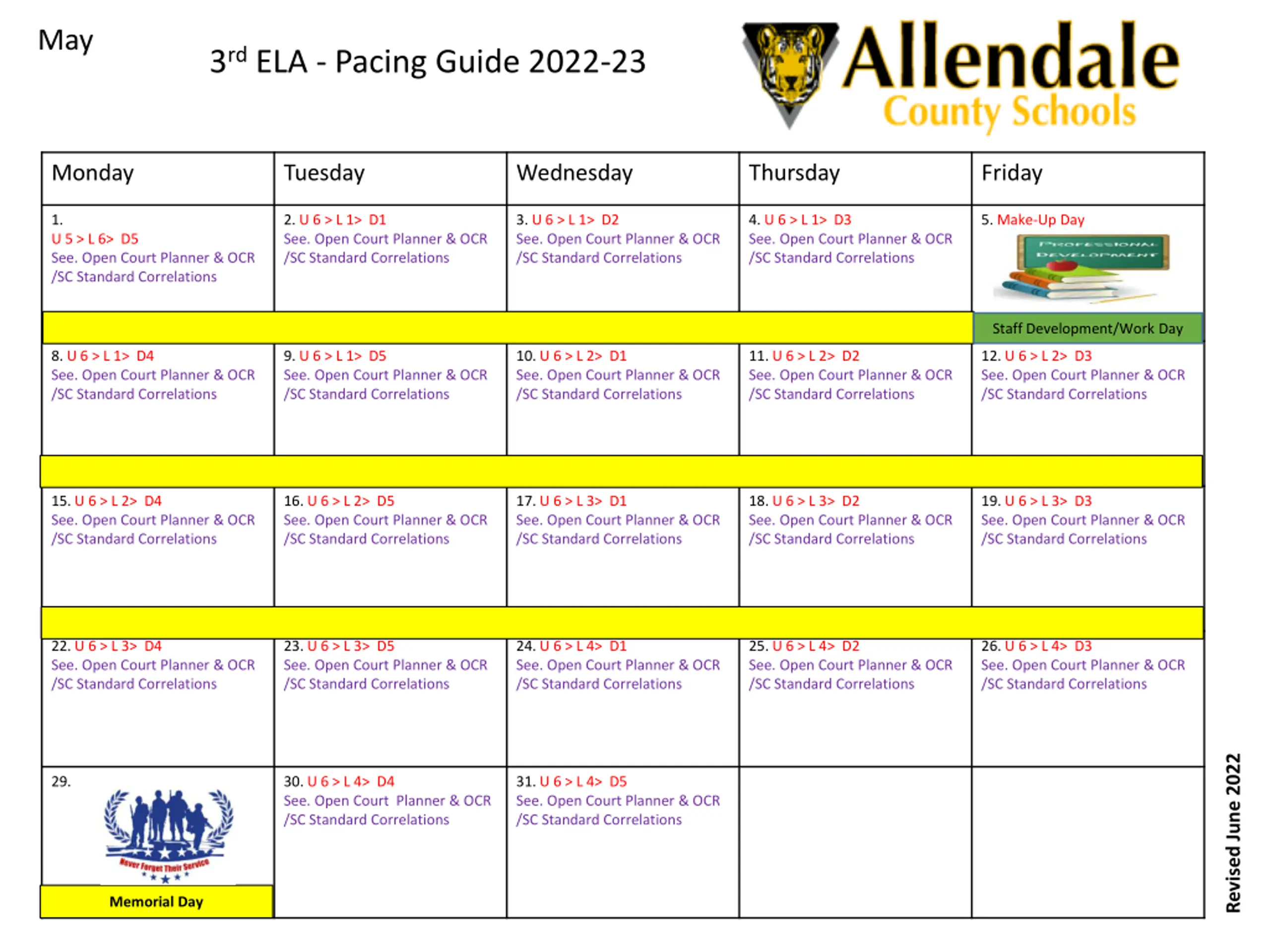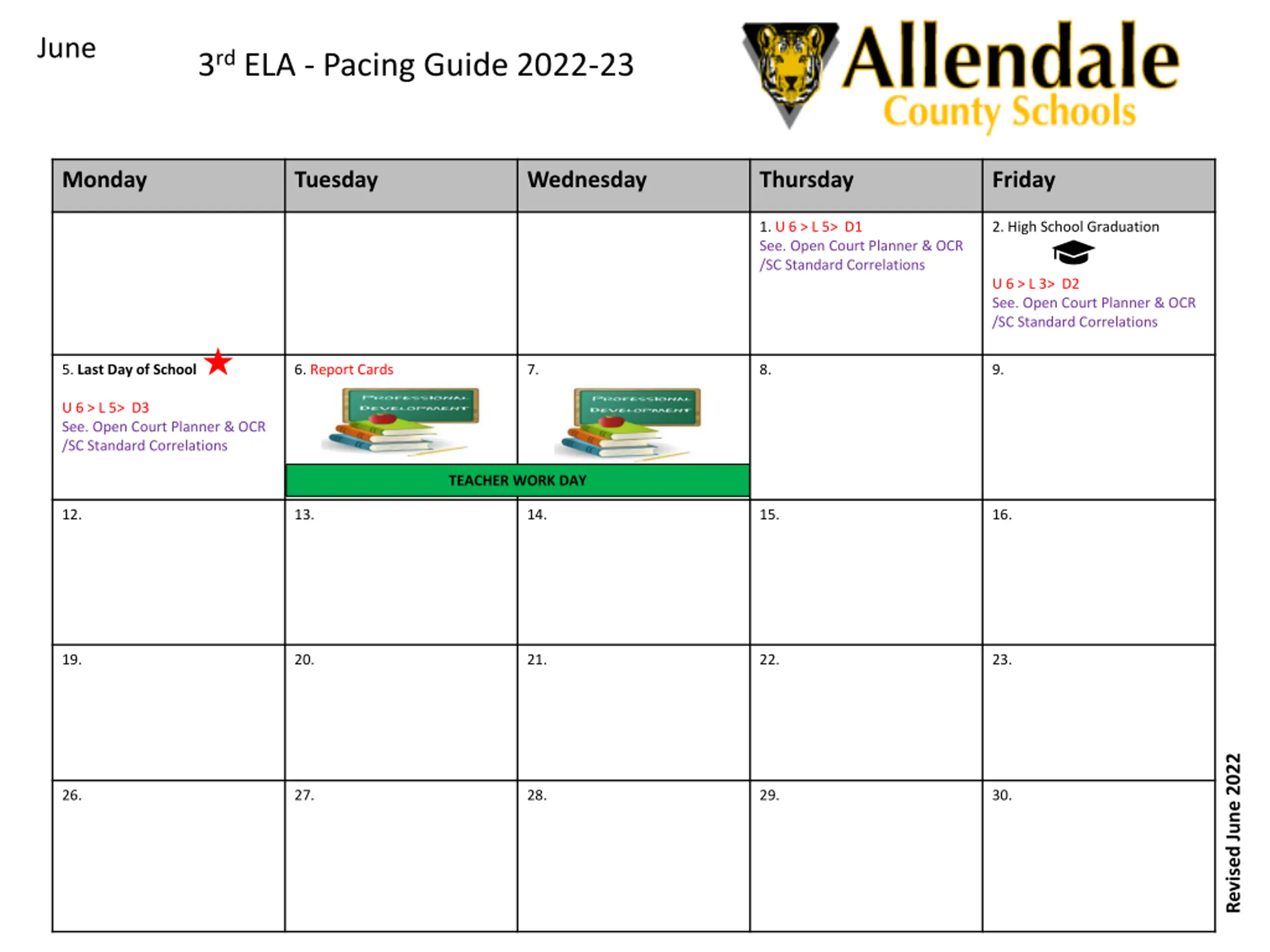 June 3rd ELA - Pacing Guide 2022-23 Monday Tuesday Wednesday Thursday Friday 1. U 6 > L 5> D1 See. Open Court Planner & OCR /SC Standard Correlations 2. High School Graduation U 6 > L 3> D2 See. Open Court Planner & OCR /SC Standard Correlations 5. Last Day of School U 6 > L 5> D3 See. Open Court Planner & OCR /SC Standard Correlations 6. Report Cards 7. 8. 9. TEACHER WORK DAY 12. 13. 14. 15. 16. 19. 20. 21. 22. 23. Revised June 2022 26. 27. 28. 29. 30.
