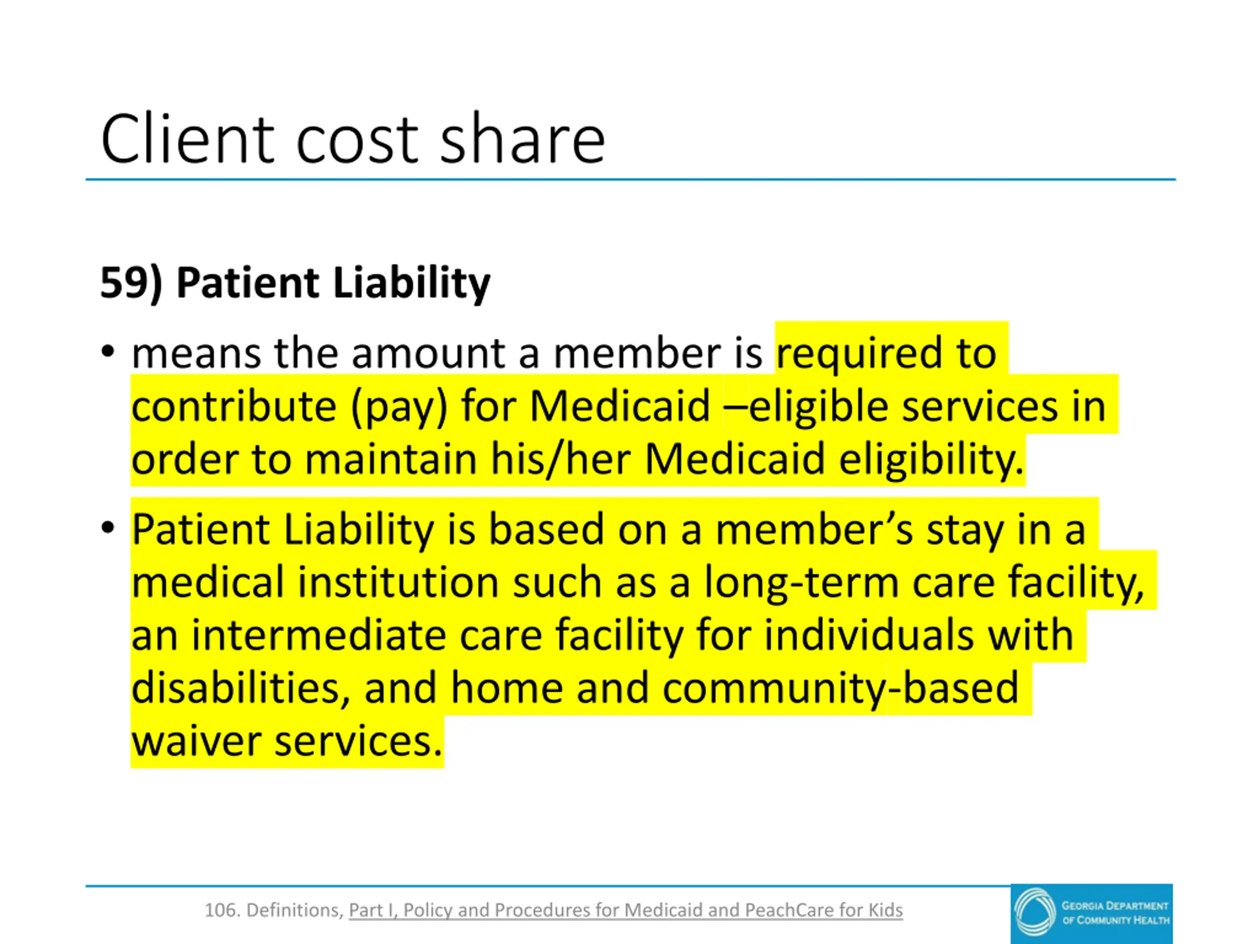 Client cost share 59) Patient Liability means the amount a member is required to contribute (pay) for Medicaid eligible services in order to maintain his/her Medicaid eligibility. Patient Liability is based on a member s stay in a medical institution such as a long-term care facility, an intermediate care facility for individuals with disabilities, and home and community-based waiver services. 106. Definitions, Part I, Policy and Procedures for Medicaid and PeachCare for Kids