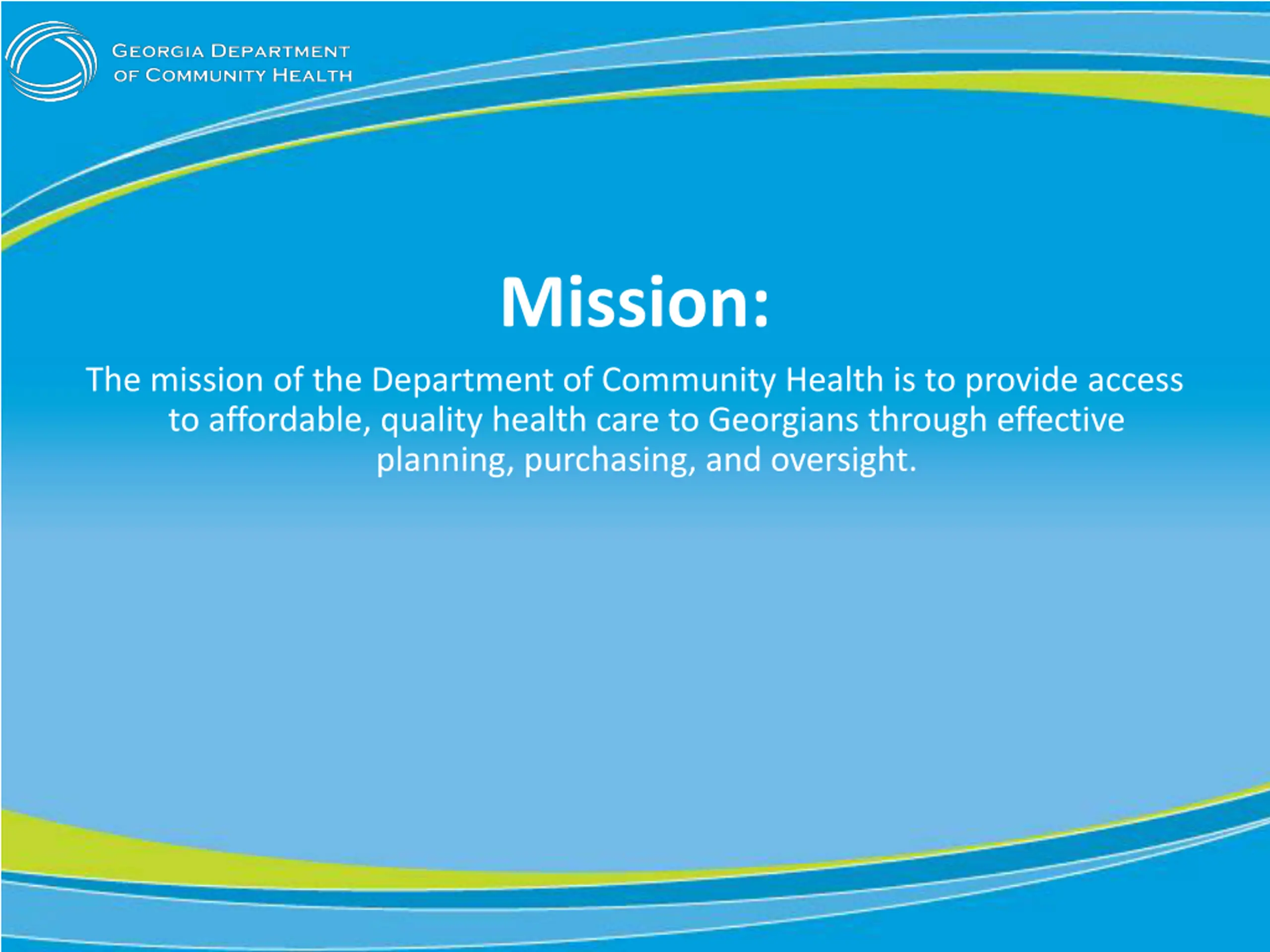 Mission: The mission of the Department of Community Health is to provide access to affordable, quality health care to Georgians through effective planning, purchasing, and oversight.