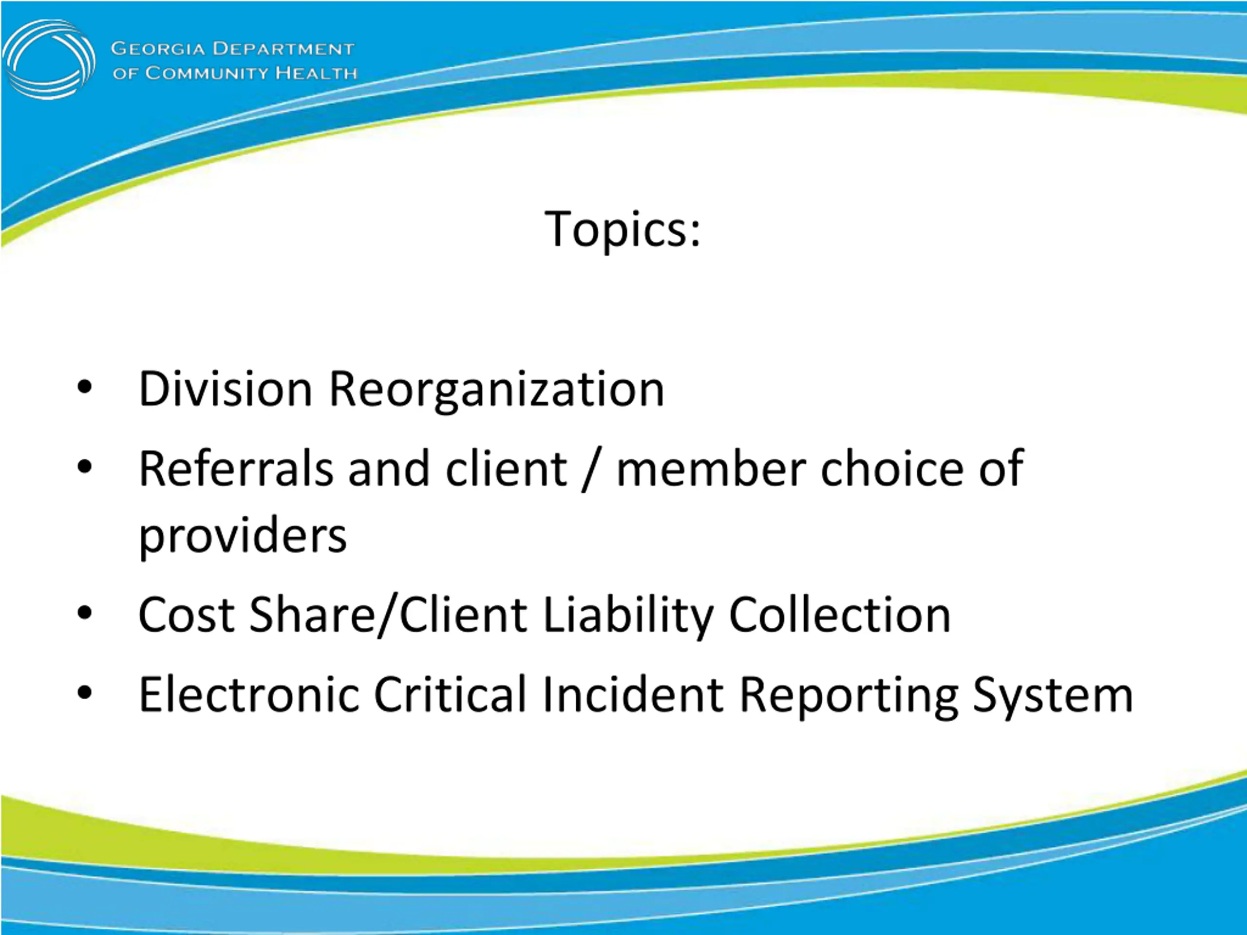 Topics: Title or Chapter Slide (use as needed; feel free to delete) Division Reorganization Referrals and client / member choice of providers Cost Share/Client Liability Collection Electronic Critical Incident Reporting System