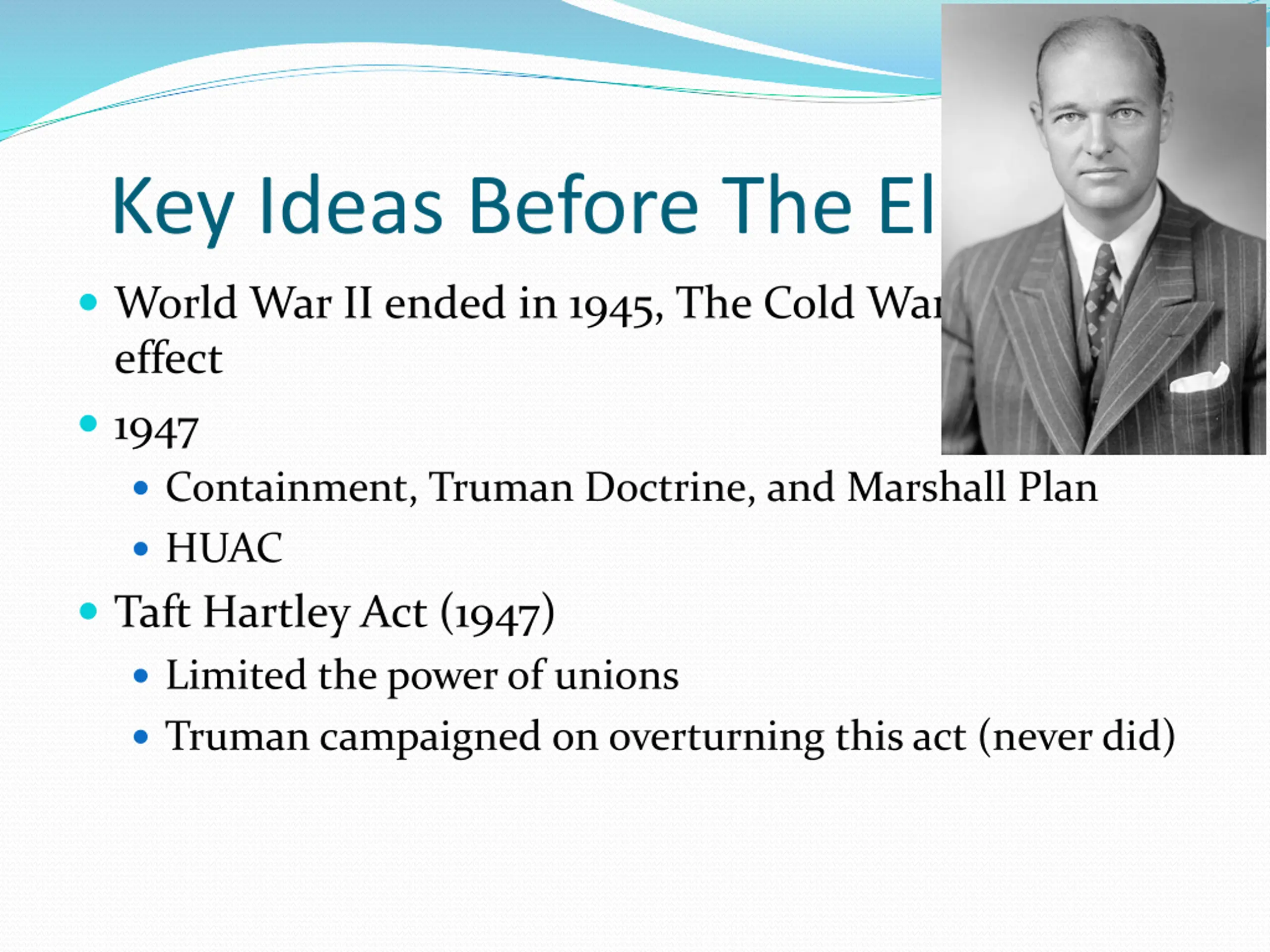 Key Ideas Before The Election World War II ended in 1945, The Cold War was in full effect 1947 Containment, Truman Doctrine, and Marshall Plan HUAC Taft Hartley Act (1947) Limited the power of unions Truman campaigned on overturning this act (never did)