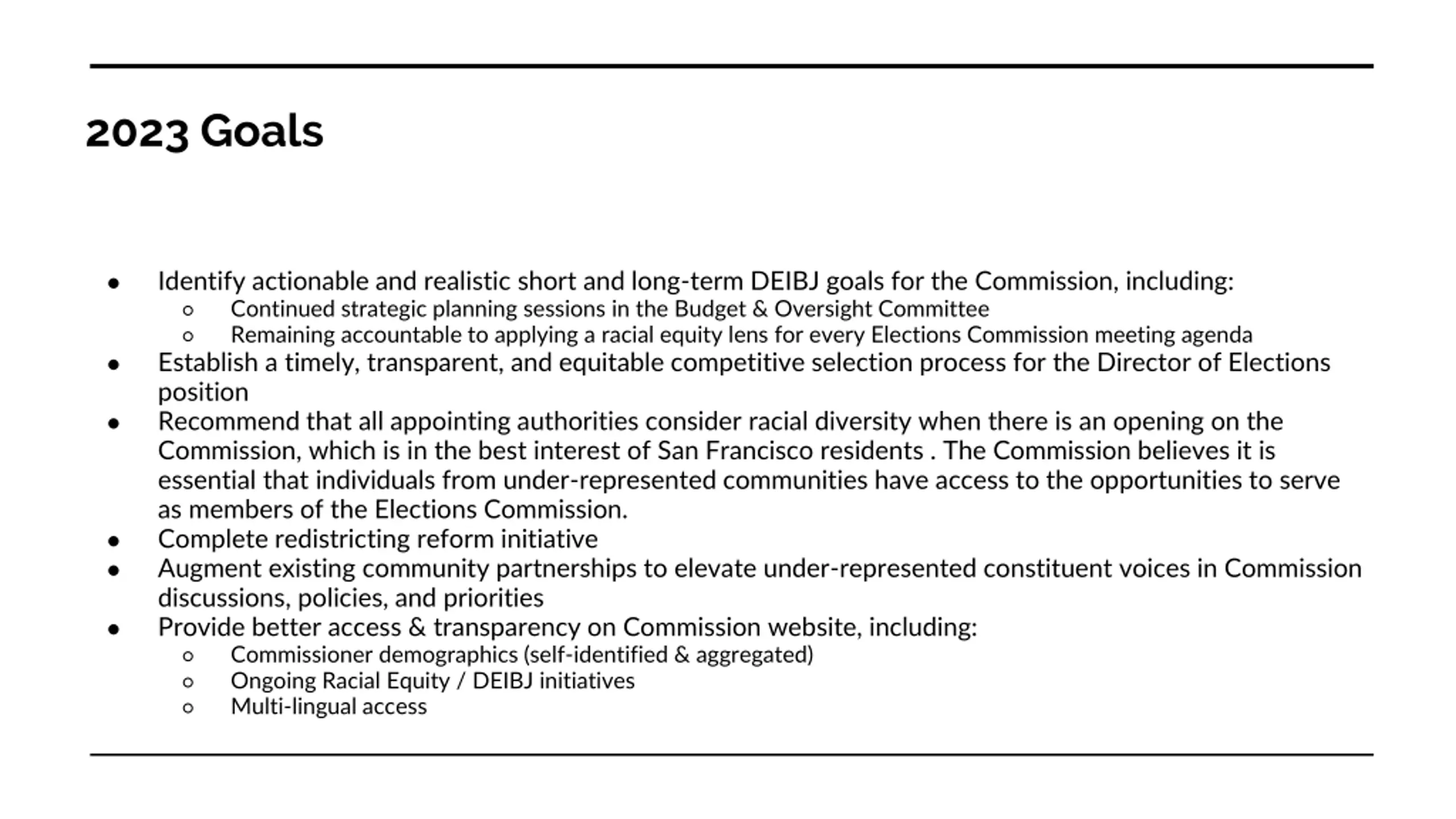2023 Goals Identify actionable and realistic short and long-term DEIBJ goals for the Commission, including: Continued strategic planning sessions in the Budget & Oversight Committee Remaining accountable to applying a racial equity lens for every Elections Commission meeting agenda Establish a timely, transparent, and equitable competitive selection process for the Director of Elections position Recommend that all appointing authorities consider racial diversity when there is an opening on the Commission, which is in the best interest of San Francisco residents . The Commission believes it is essential that individuals from under-represented communities have access to the opportunities to serve as members of the Elections Commission. Complete redistricting reform initiative Augment existing community partnerships to elevate under-represented constituent voices in Commission discussions, policies, and priorities Provide better access & transparency on Commission website, including: Commissioner demographics (self-identified & aggregated) Ongoing Racial Equity / DEIBJ initiatives Multi-lingual access