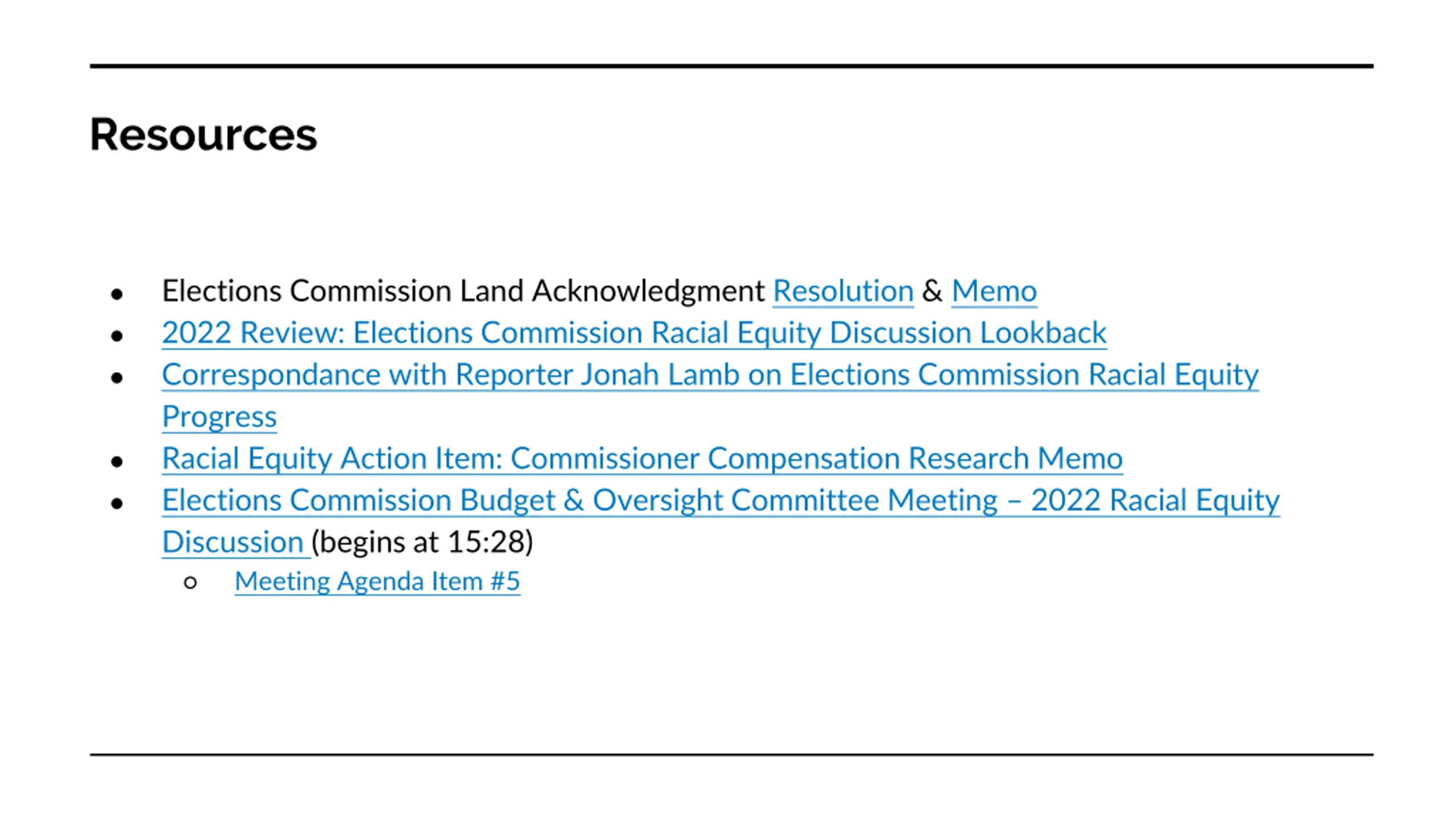 Resources Elections Commission Land Acknowledgment Resolution & Memo 2022 Review: Elections Commission Racial Equity Discussion Lookback Correspondance with Reporter Jonah Lamb on Elections Commission Racial Equity Progress Racial Equity Action Item: Commissioner Compensation Research Memo Elections Commission Budget & Oversight Committee Meeting 2022 Racial Equity Discussion (begins at 15:28) Meeting Agenda Item #5