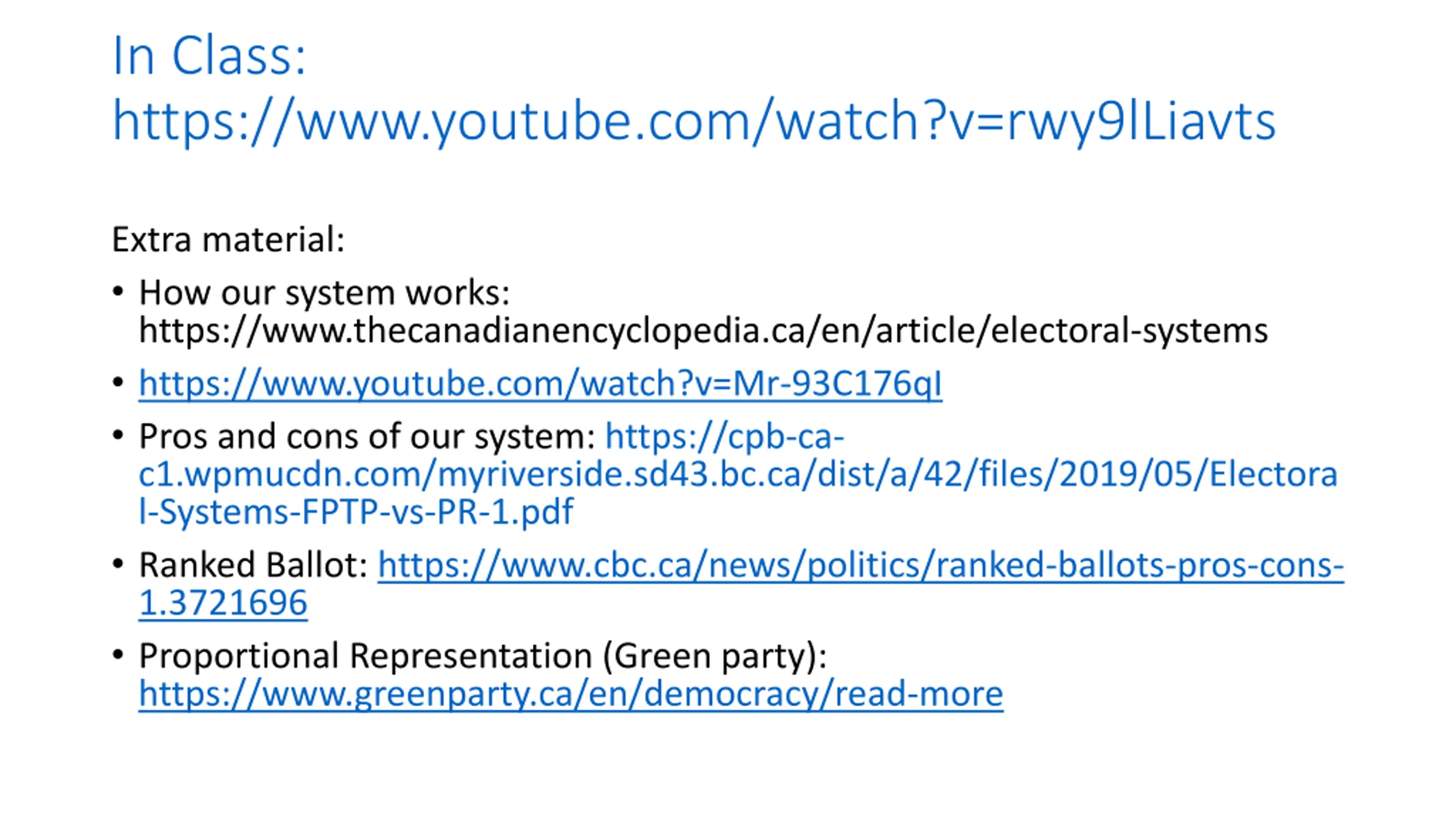 In Class: https://www.youtube.com/watch?v=rwy9lLiavts Extra material: How our system works: https://www.thecanadianencyclopedia.ca/en/article/electoral-systems https://www.youtube.com/watch?v=Mr-93C176qI Pros and cons of our system: https://cpb-ca- c1.wpmucdn.com/myriverside.sd43.bc.ca/dist/a/42/files/2019/05/Electora l-Systems-FPTP-vs-PR-1.pdf Ranked Ballot: https://www.cbc.ca/news/politics/ranked-ballots-pros-cons- 1.3721696 Proportional Representation (Green party): https://www.greenparty.ca/en/democracy/read-more