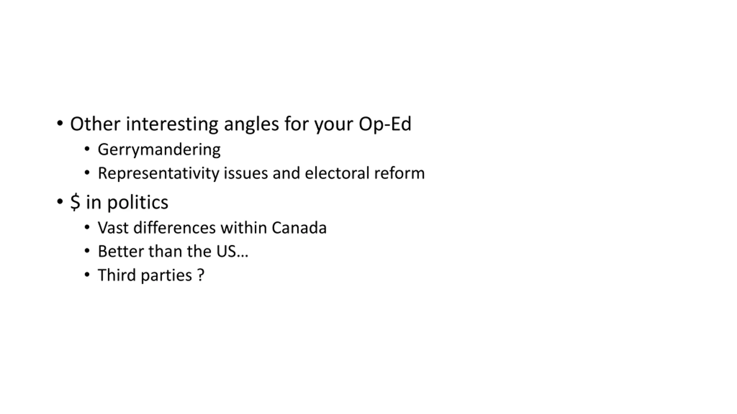 Other interesting angles for your Op-Ed Gerrymandering Representativity issues and electoral reform $ in politics Vast differences within Canada Better than the US Third parties ?
