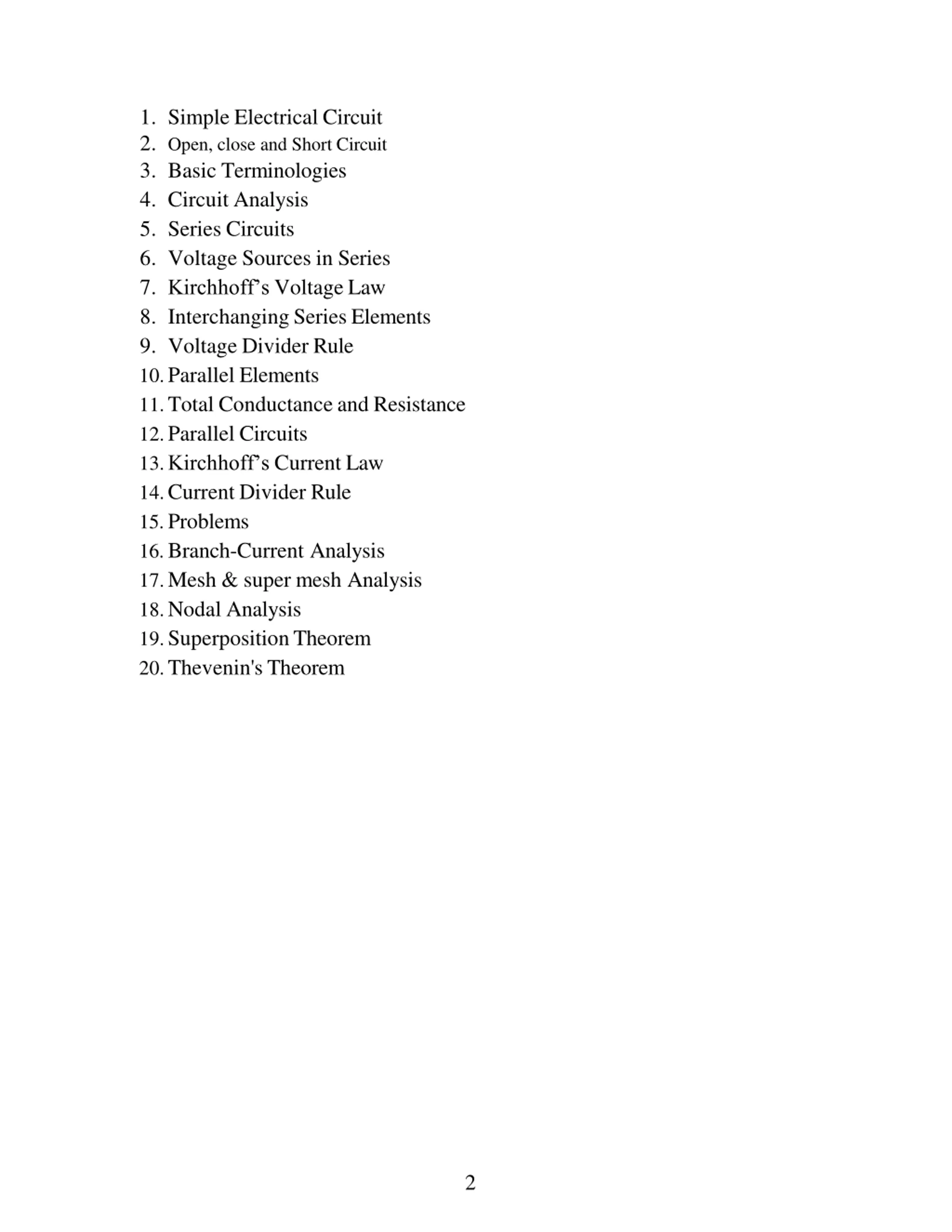 1. Simple Electrical Circuit 2. Open, close and Short Circuit 3. Basic Terminologies 4. Circuit Analysis 5. Series Circuits 6. Voltage Sources in Series 7. Kirchhoff s Voltage Law 8. Interchanging Series Elements 9. Voltage Divider Rule 10.Parallel Elements 11.Total Conductance and Resistance 12.Parallel Circuits 13.Kirchhoff s Current Law 14.Current Divider Rule 15.Problems 16.Branch-Current Analysis 17.Mesh & super mesh Analysis 18.Nodal Analysis 19.Superposition Theorem 20.Thevenin's Theorem 2